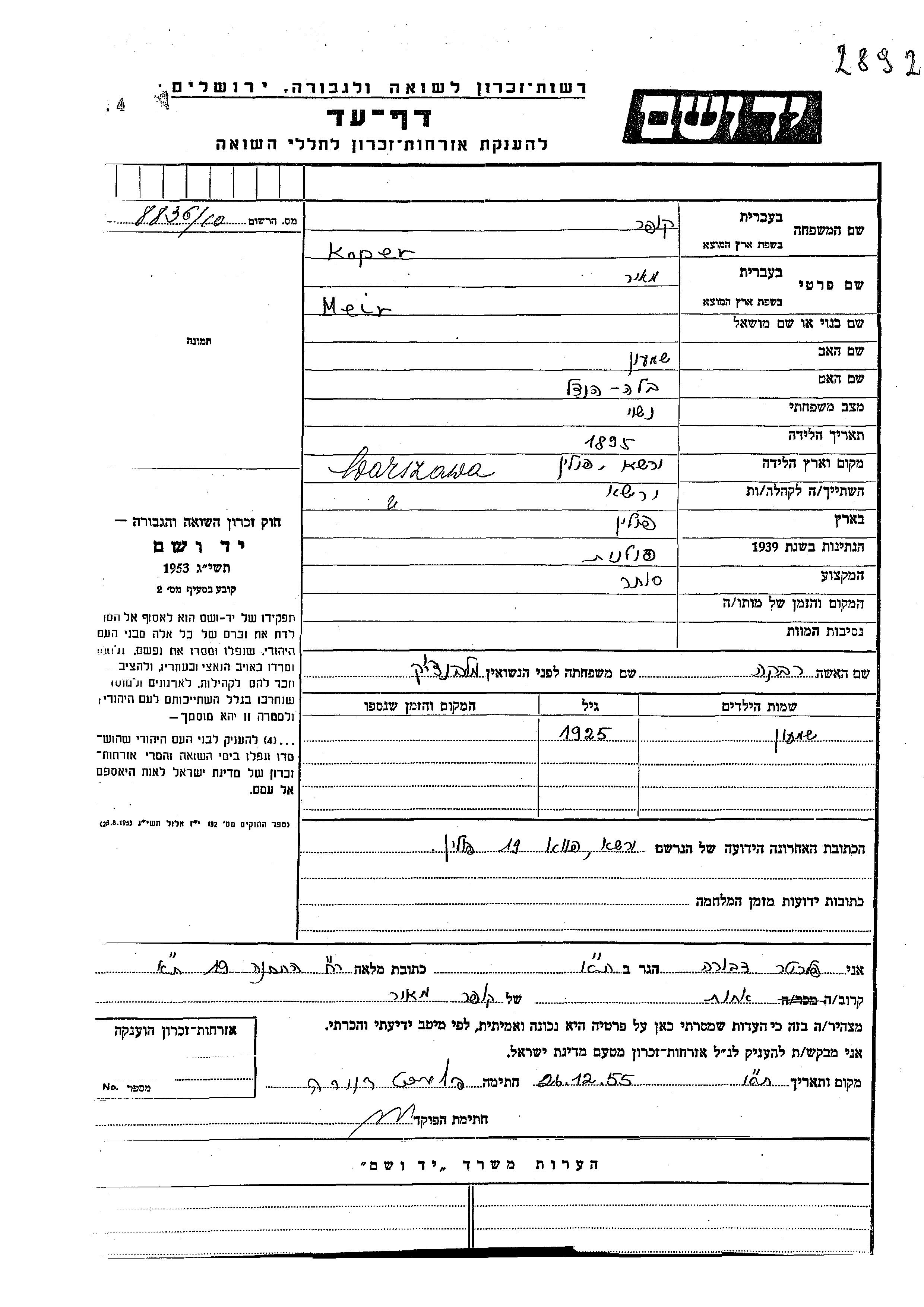 Shimon Koper wurde im Jahr 1925 geboren. Er war der Sohn von Meir und Rivka, geb. Malovanchik. Er war Kind. Vor dem Zweiten Weltkrieg lebte er in Warszawa, Polen.