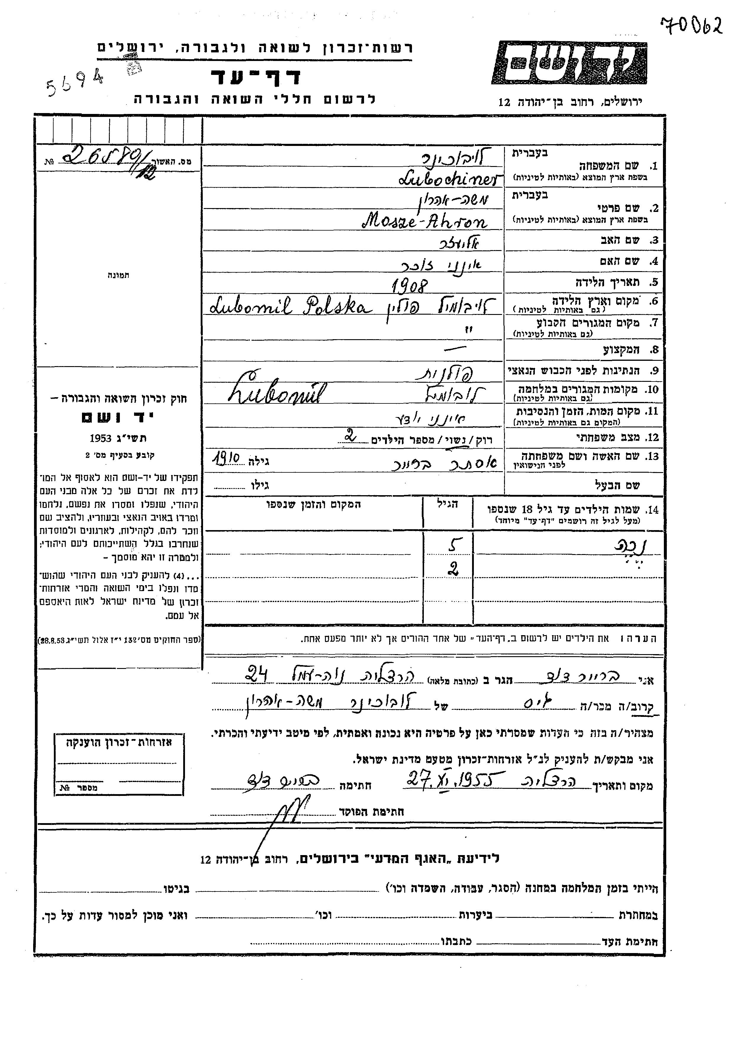 Vorname unbekannt Lubochiner wurde Er/sie war der/ die Sohn/Tochter von Mosze Ahron und Ester, geb. Braier. Er/Sie war Kind. Vor dem Zweiten Weltkrieg er/sie in Lubomil, Polen. Während des Krieges war er/sie in Lubomil, Polen.