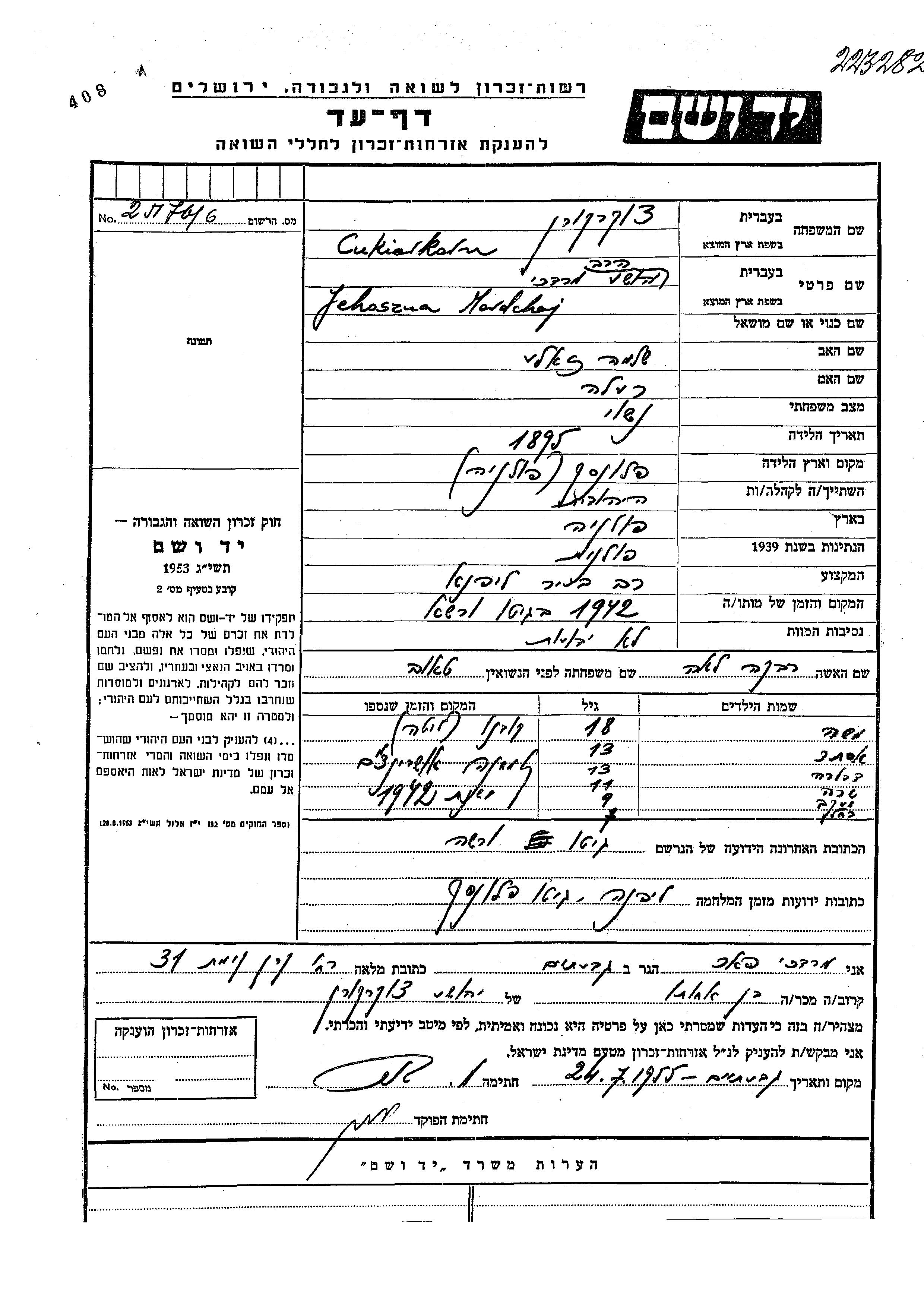 Ester Cukierkorn wurde Sie war die Tochter von Yehoszua Mordchaj und Rivka Lea, geb. Taub. Sie war Kind. Während des Krieges war sie in Plonsk, Polen.