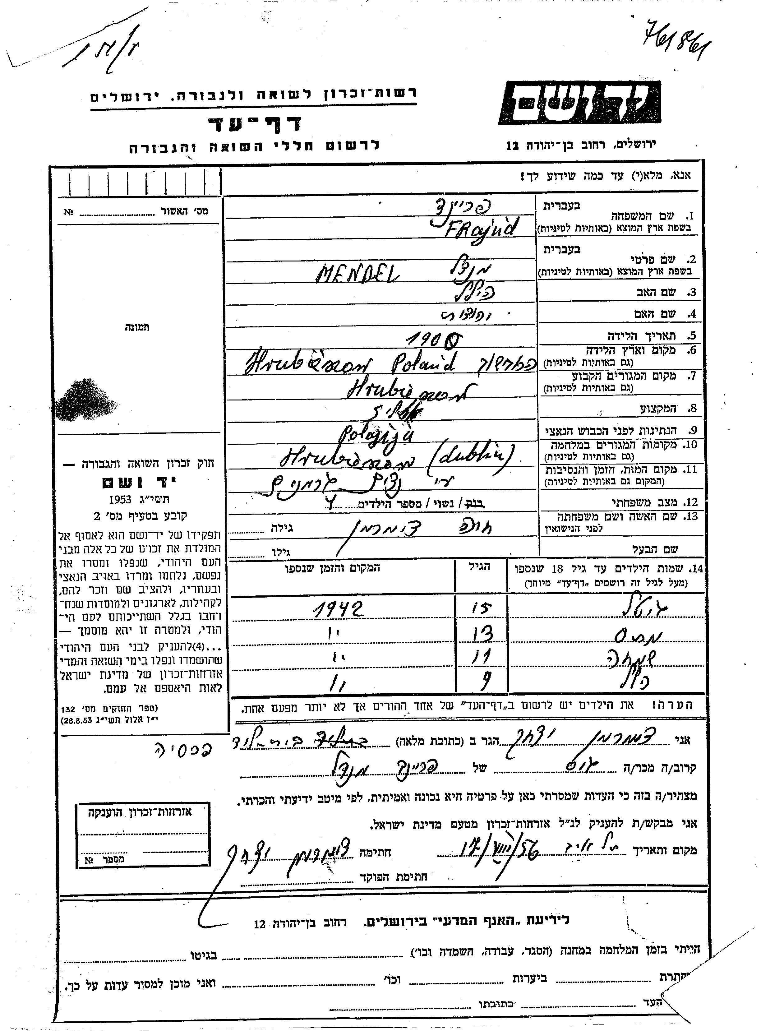 Hilel Frajnd wurde Er war der Sohn von Mendel und Khaia, geb. Tzimerman. Er war Kind. Vor dem Zweiten Weltkrieg lebte er in Hrubieszow, Polen. Während des Krieges war er in Hrubieszow, Polen.