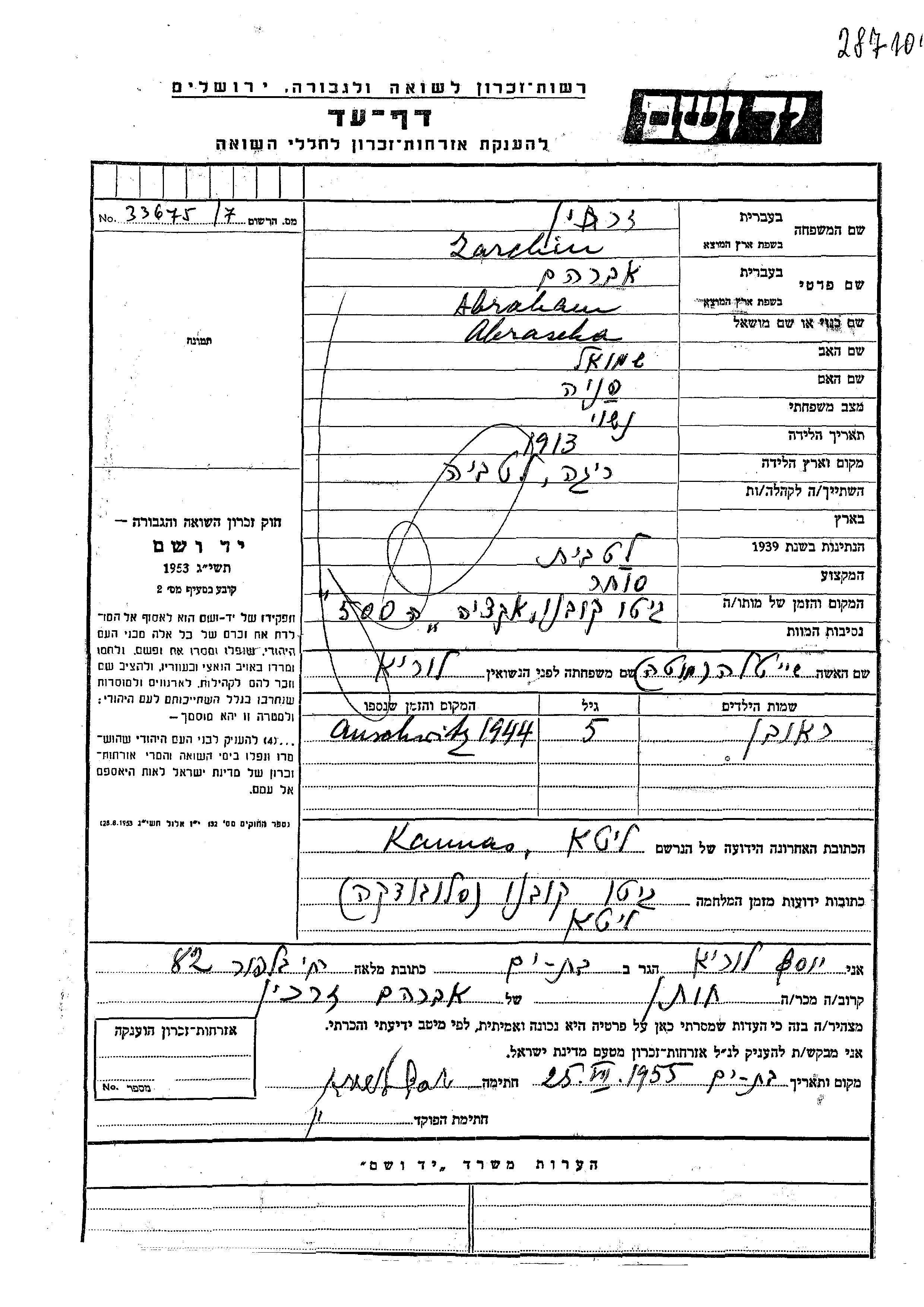 Reuven Zarkhin Zarchin wurde Er war der Sohn von Abraham und Sheitale, geb. Lurie. Er war Kind. Während des Krieges war er in Kowno, Litauen.