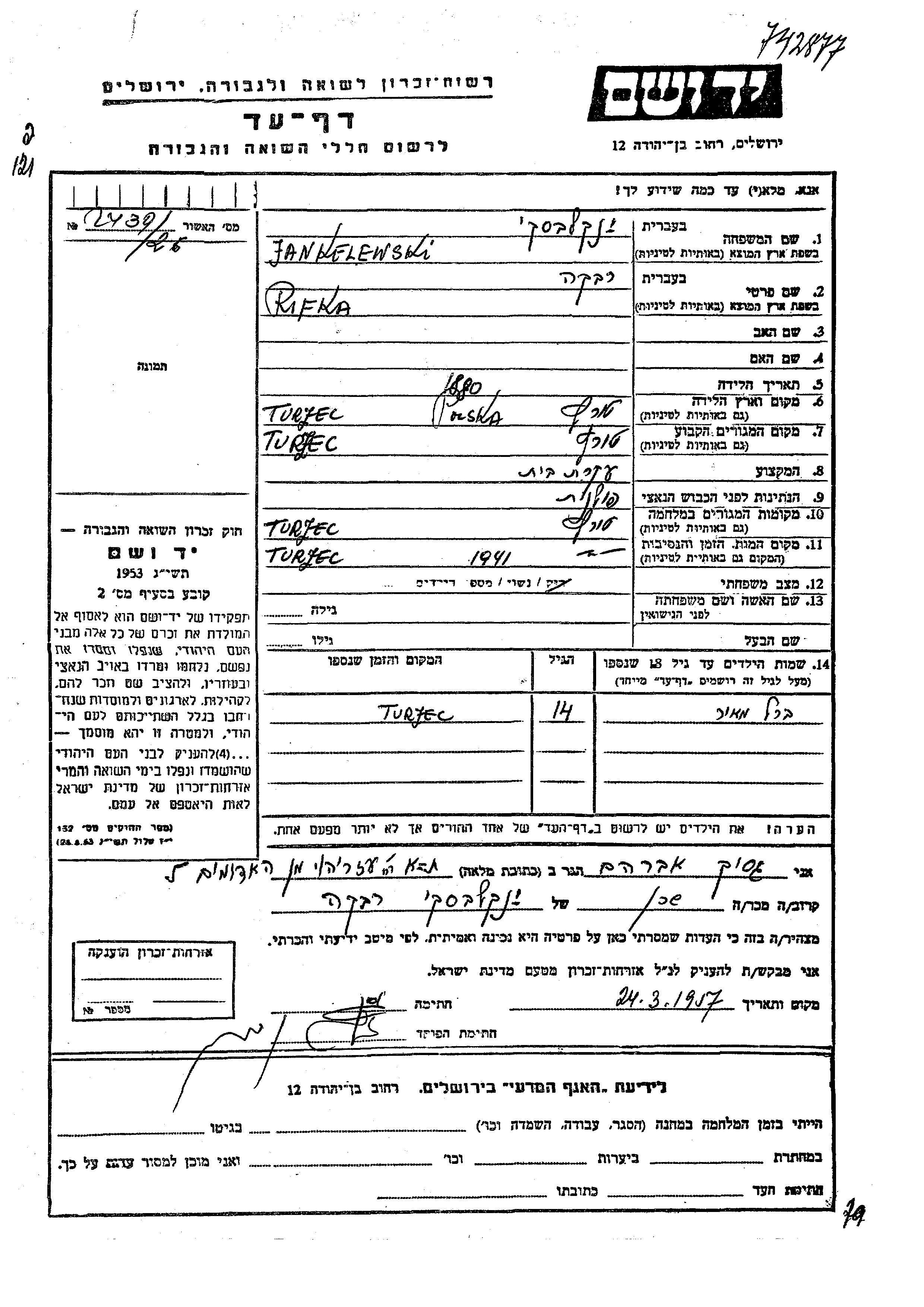 Berl Meir Jankelewski wurde Er war der Sohn von Rivka. Er war Kind. Vor dem Zweiten Weltkrieg lebte er in Turzec, Polen. Während des Krieges war er in Turzec, Polen.