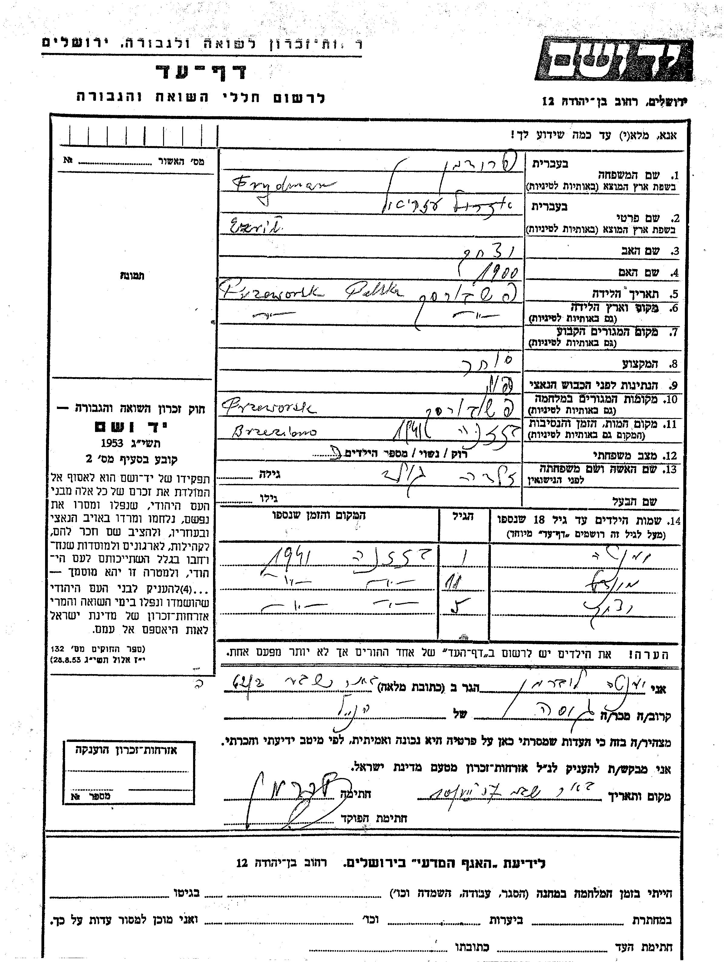 Frydman Yenta Przeworsk, Polen Gedenkblatt