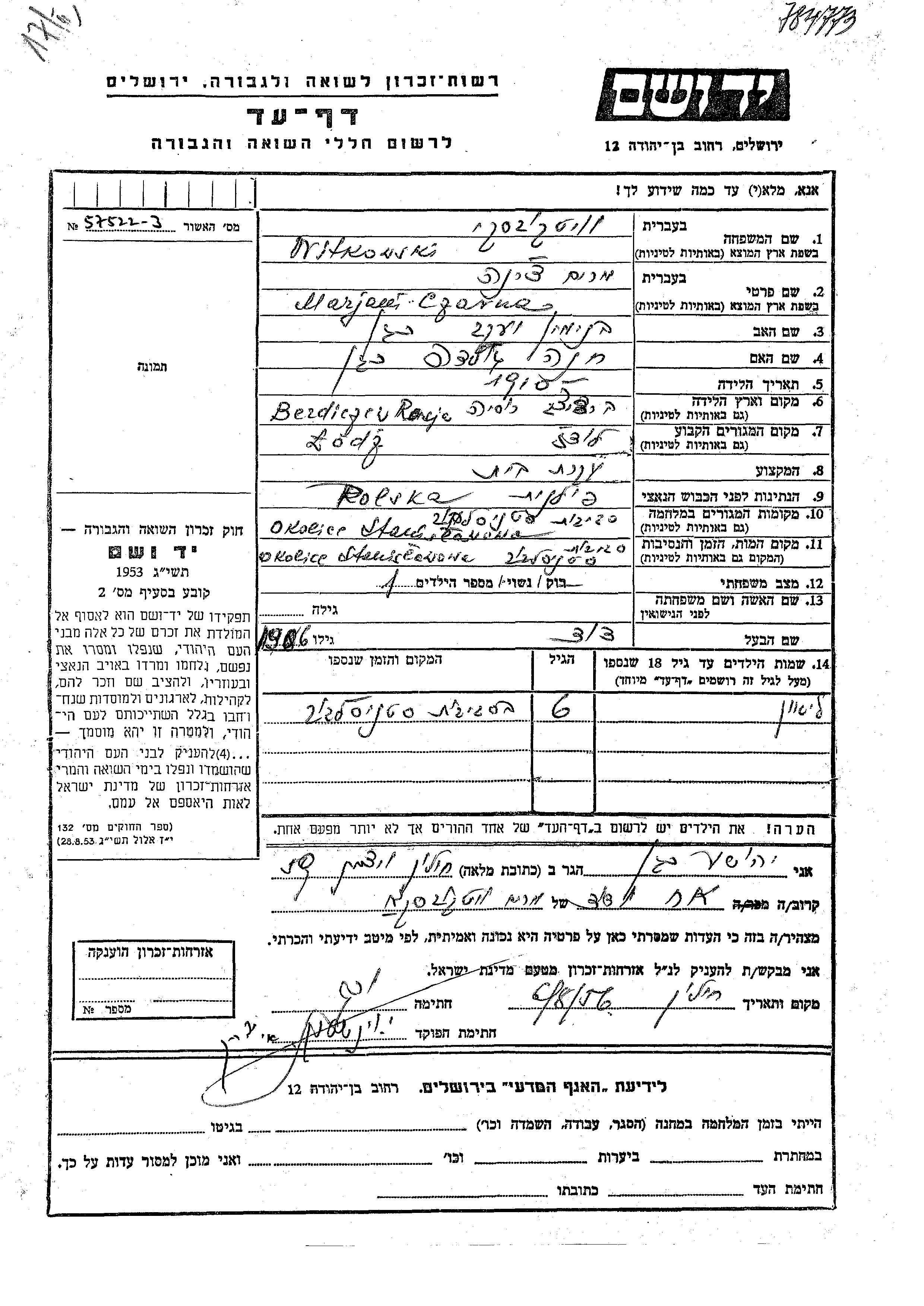 Lion Witkowski wurde Er war der Sohn von David und Marjam Czarna, geb. Kagan. Er war Kind. Vor dem Zweiten Weltkrieg lebte er in Lodz, Polen. Während des Krieges war er in Stanislowow, Polen.