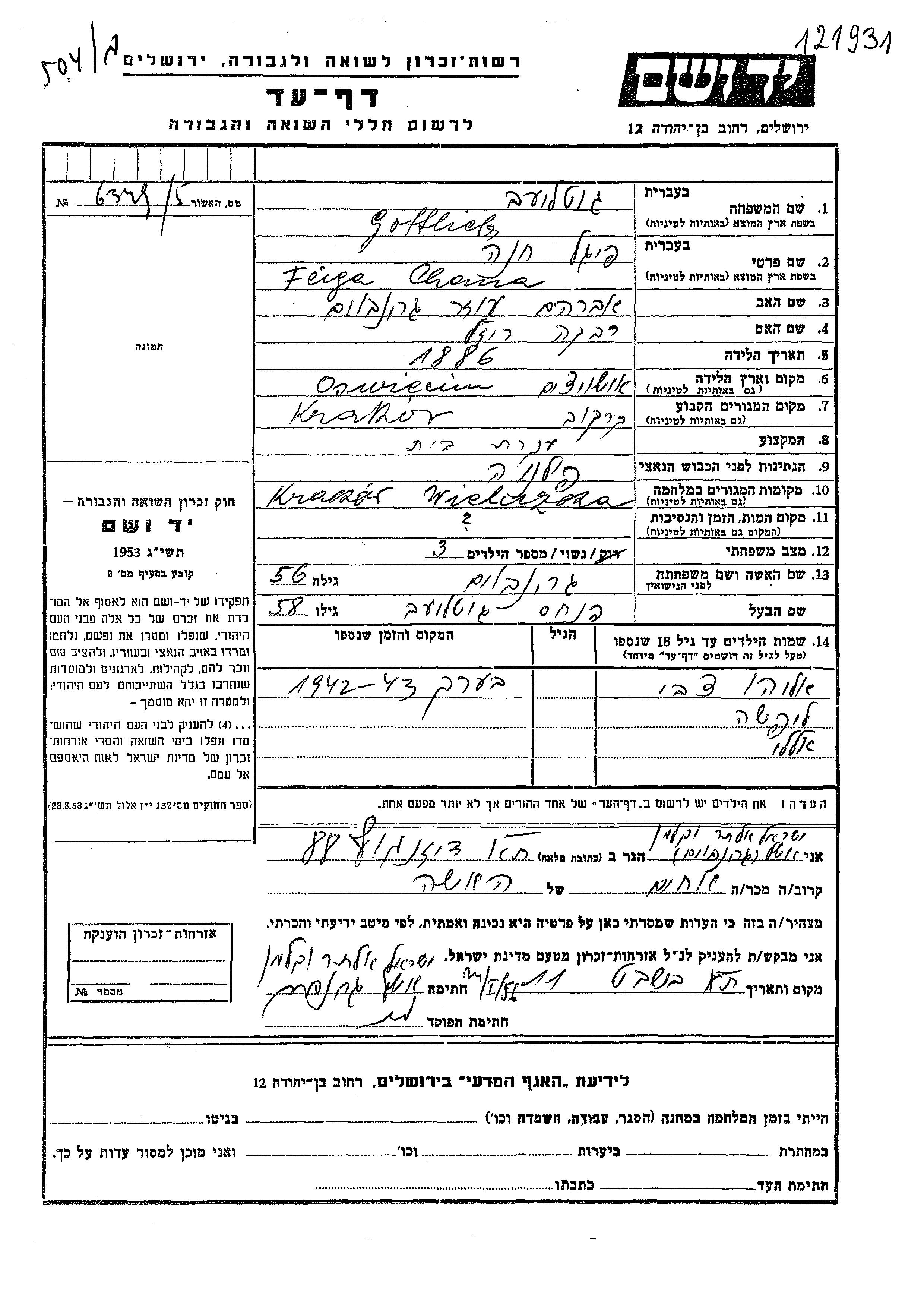 Lifsha Gottlieb wurde Sie war die Tochter von Pinkhas und Chana Feigl, geb. Grinboim. Sie war Kind. Vor dem Zweiten Weltkrieg lebte sie in Krakow, Polen. Während des Krieges war sie in Krakow, Polen.