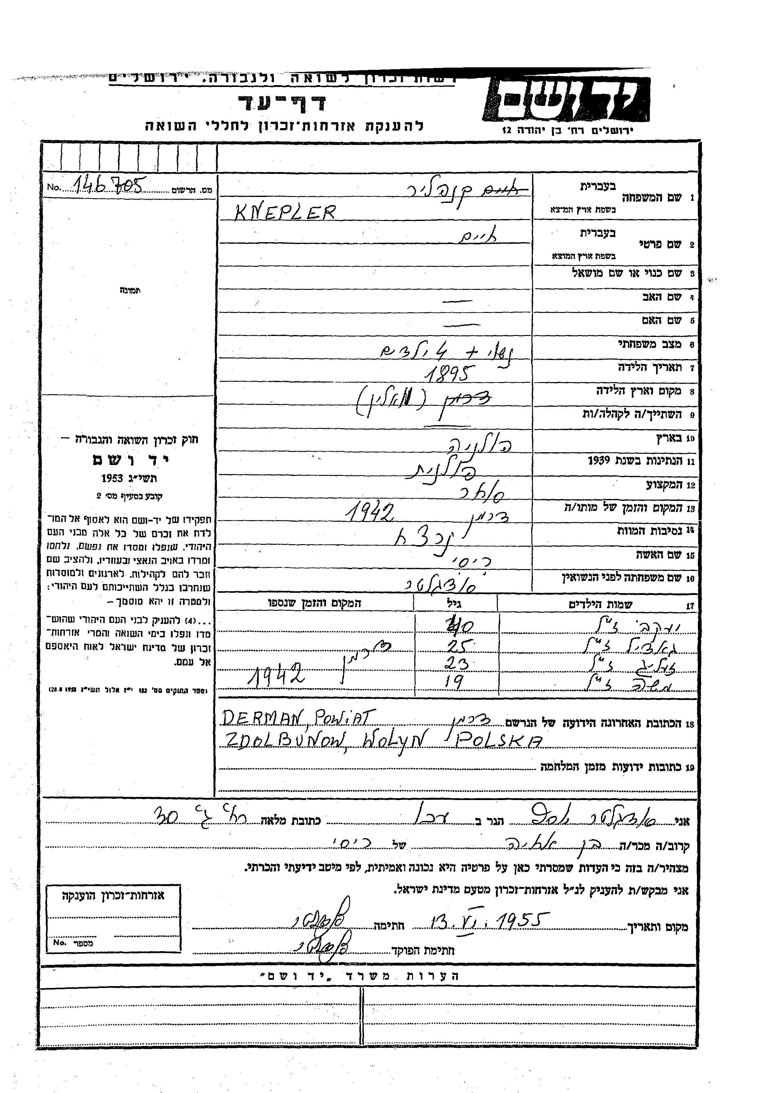 Zelig Knepler wurde Er war der Sohn von Khaim und Risi, geb. Sudhalter. Vor dem Zweiten Weltkrieg lebte er in Zdolbunow, Polen. Während des Krieges war er in Zdolbunow, Polen.