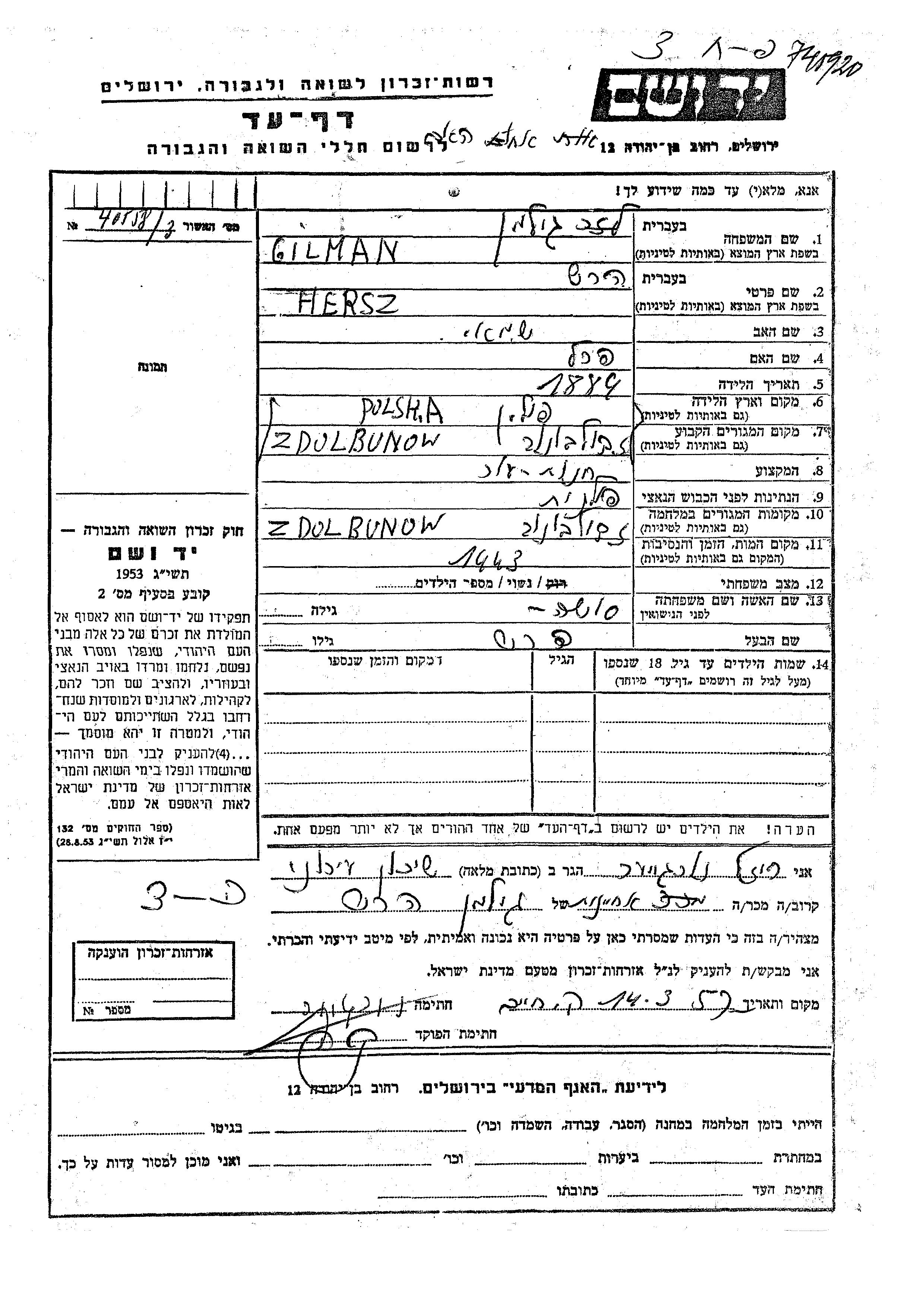 Hersz Gilman wurde im Jahr 1889 in Polen geboren. Er war der Sohn von Shamai und Perel. Er war mit Sosha Verheiratet. Vor dem Zweiten Weltkrieg lebte er in Zdolbunow, Polen. Während des Krieges war er in Zdolbunow, Polen.