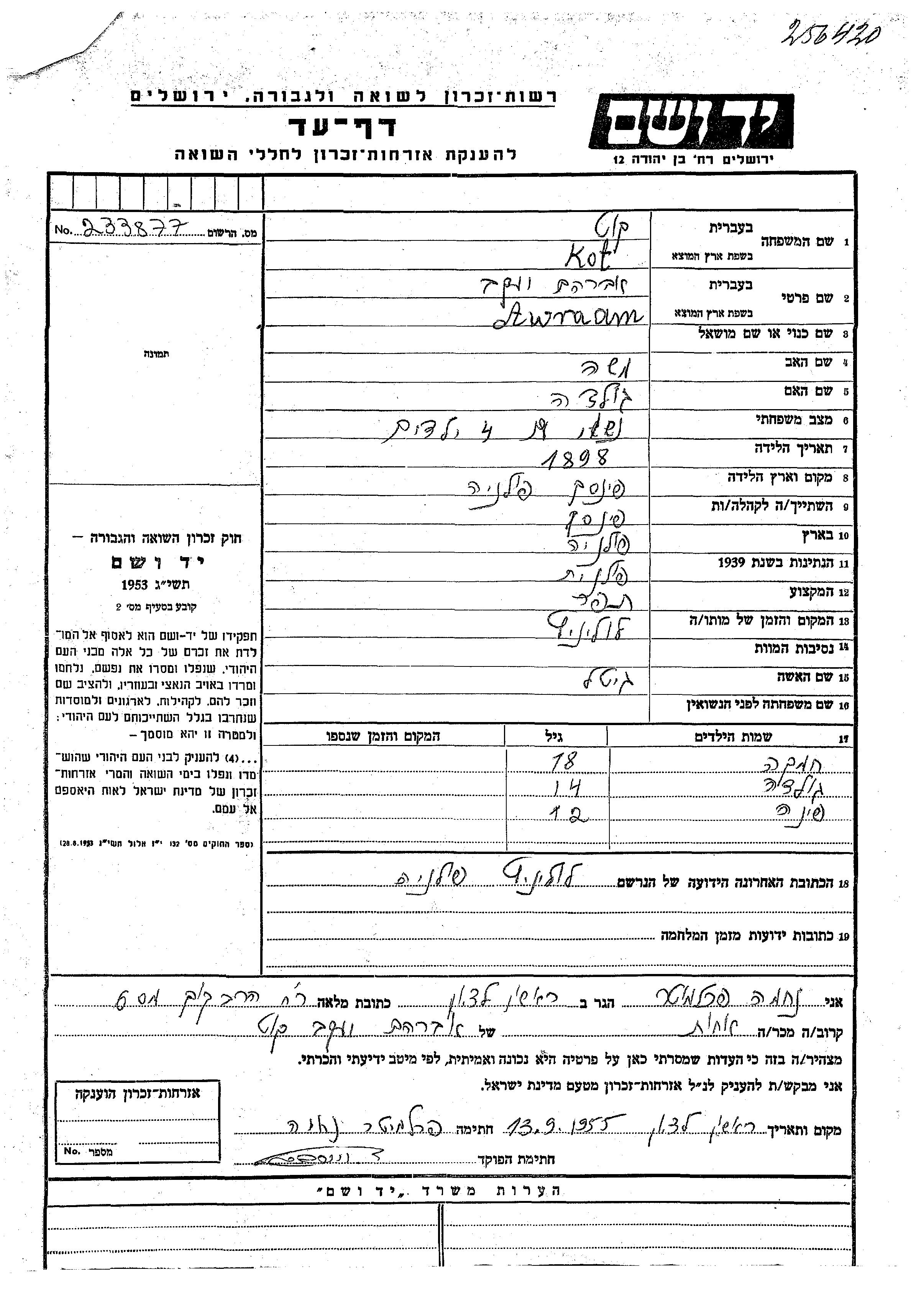 Golda Kot wurde Sie war die Tochter von Awraam Yaakov und Gitel. Sie war Kind. Vor dem Zweiten Weltkrieg lebte sie in Pinsk, Polen. Während des Krieges war sie in Luliniec, Polen.