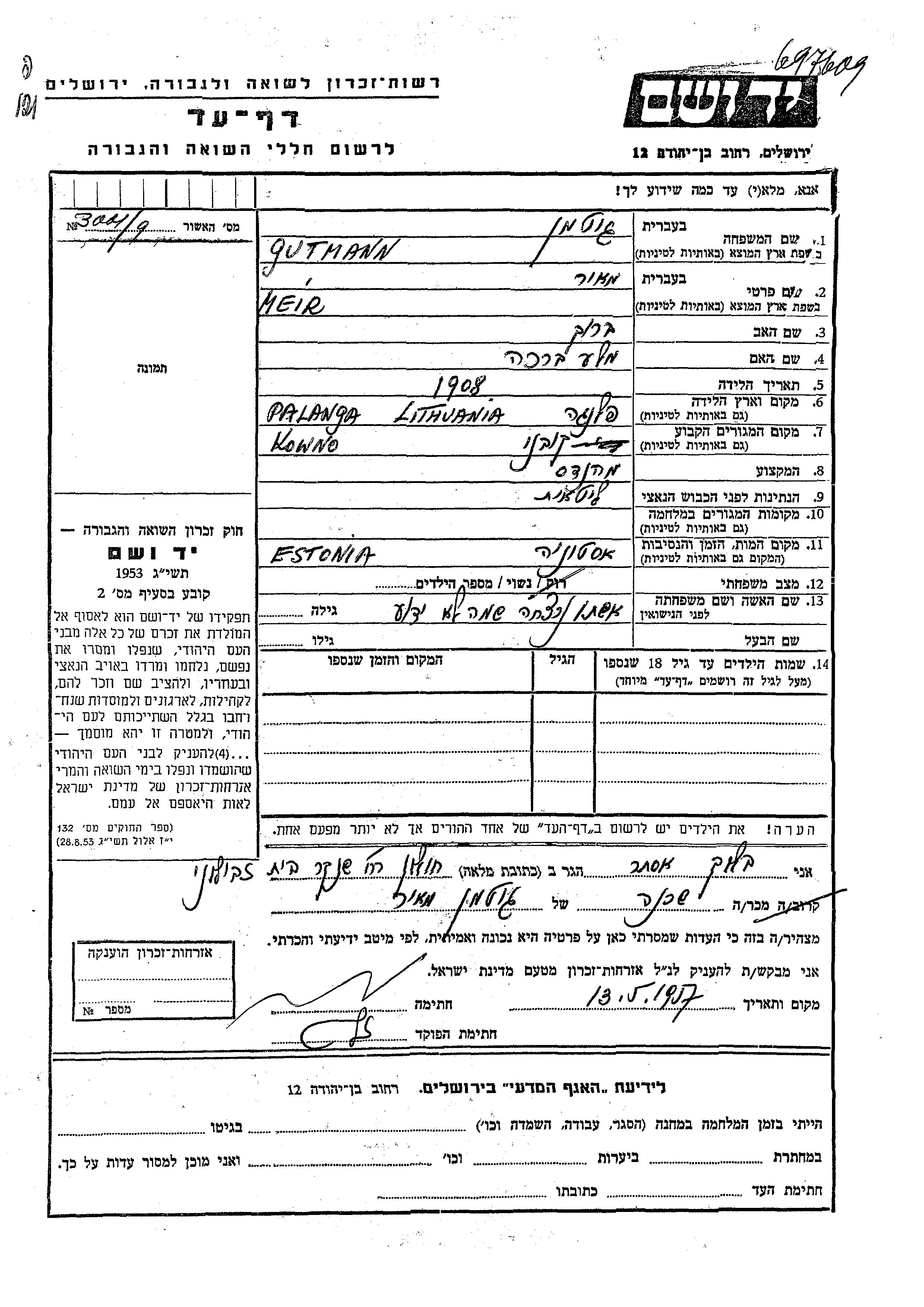 Meir Gutmann wurde im Jahr 1908 in Palanga, Litauen geboren. Er war der Sohn von Barukh und Malka Brakha. Er war Ingenieur und Verheiratet. Vor dem Zweiten Weltkrieg lebte er in Kowno, Litauen.