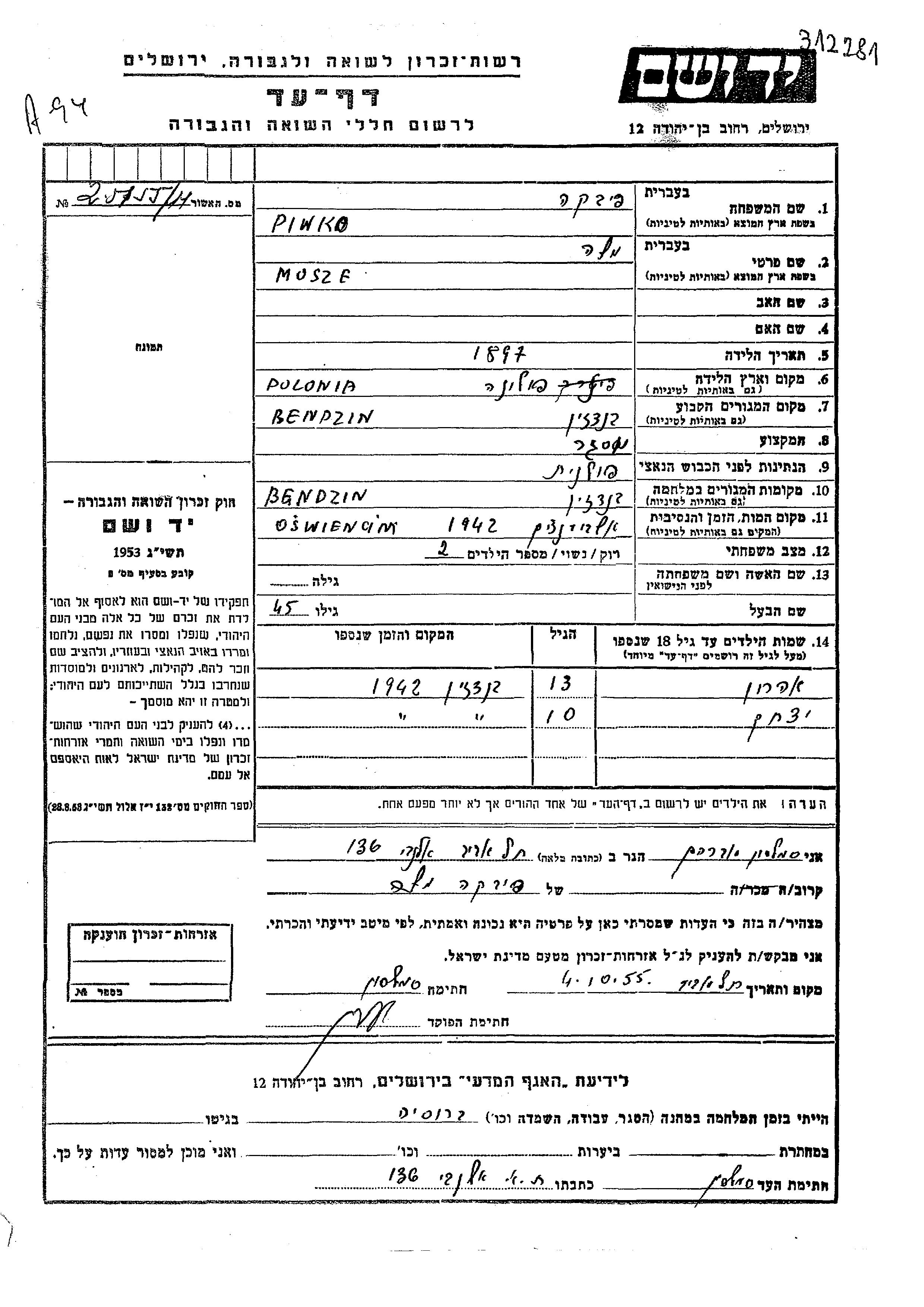 Yitzkhak Piwko wurde Er war der Sohn von Mosze. Er war Kind. Vor dem Zweiten Weltkrieg lebte er in Bendzin, Polen. Während des Krieges war er in Bendzin, Polen.