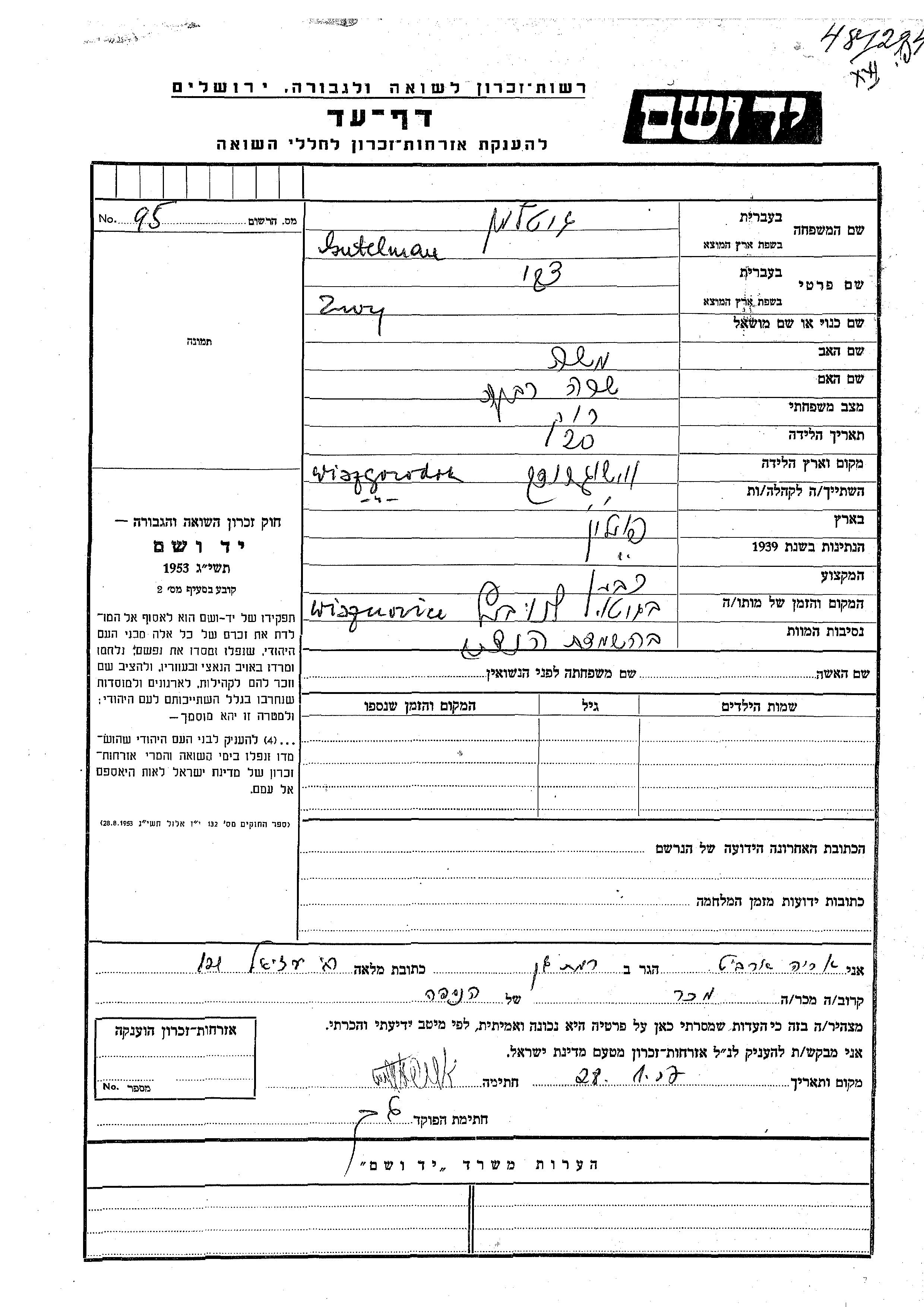 Zwy wurde in der Schoah ermordet. Todesort: Wisniowiec, Polen.