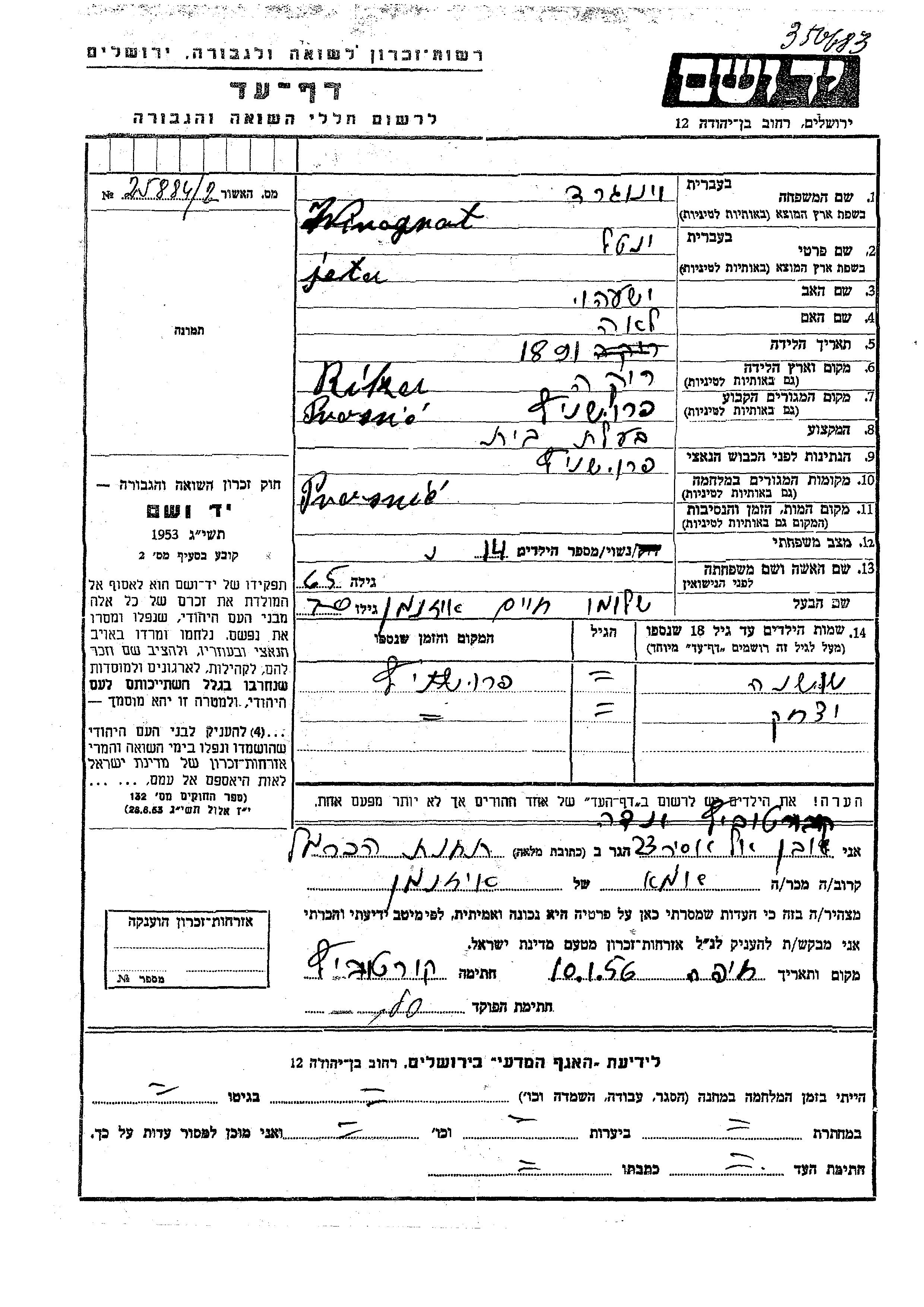 Yitzkhak Winograt Eizenman wurde Er war der Sohn von Shlomo Khaim und Jeta Yentl. Er war Kind. Vor dem Zweiten Weltkrieg lebte er in Prusnitz, Polen. Während des Krieges war er in Prusnitz, Polen.