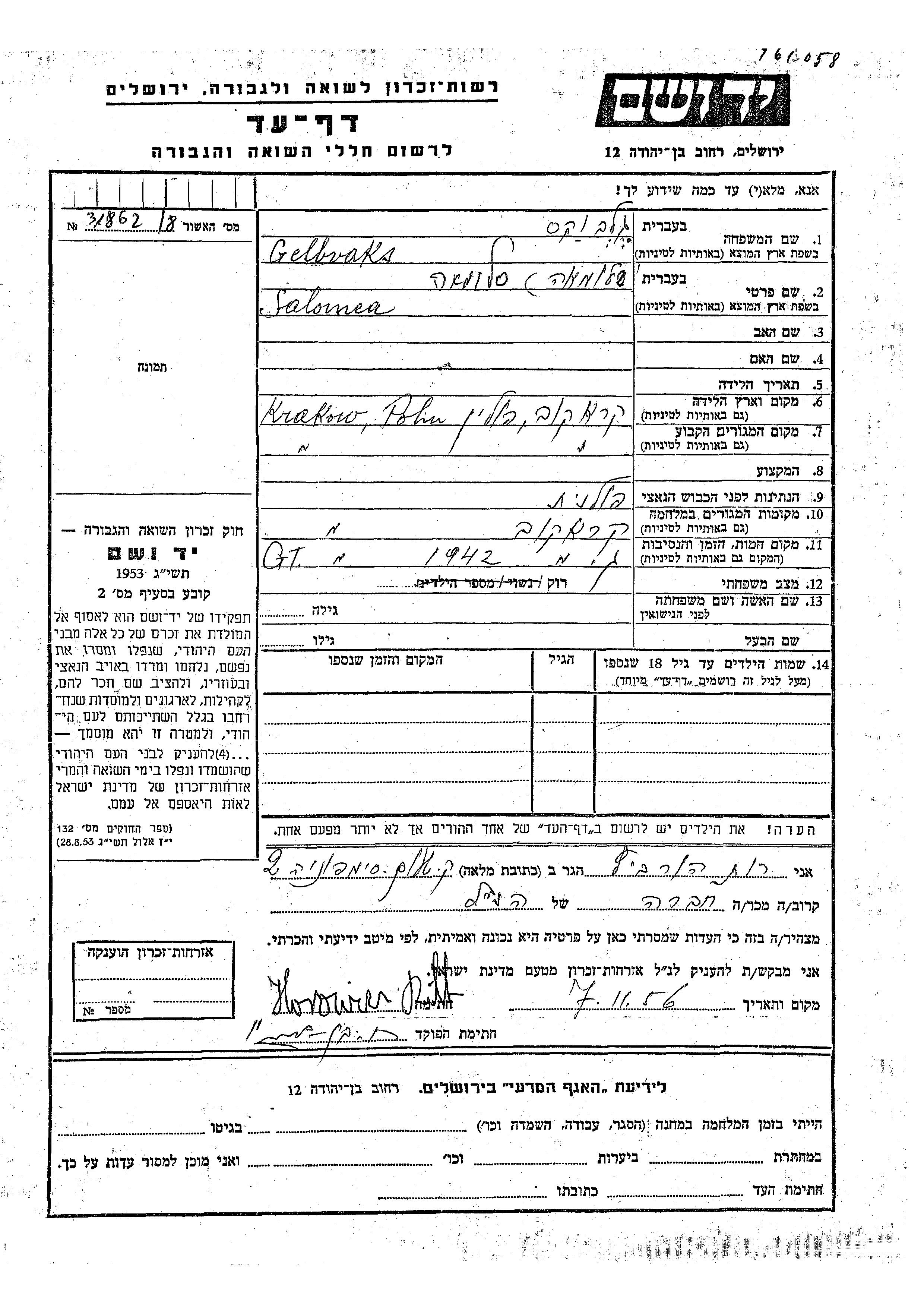 Salomea Gelbvaks wurde in Krakow, Polen geboren. Sie war Ledig. Vor dem Zweiten Weltkrieg lebte sie in Krakow, Polen. Während des Krieges war sie in Krakow, Polen.