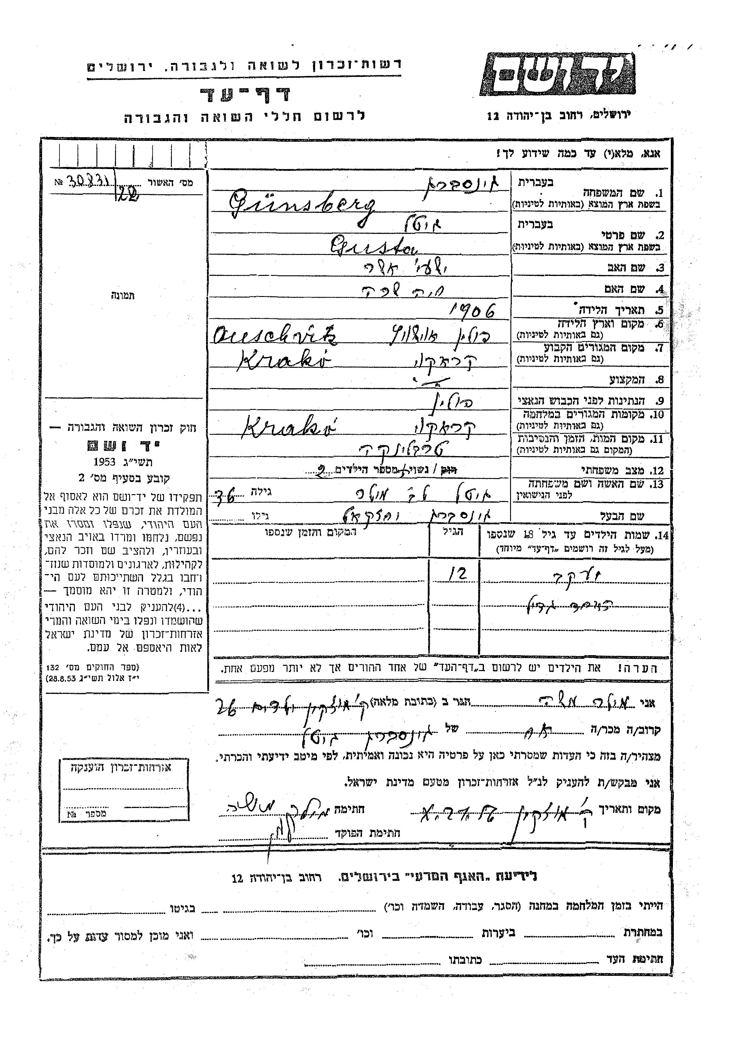 Gusta Gitel Ginsberg Muler, geb. Ginsberg wurde im Jahr 1906 in Auschwitz, Polen geboren. Sie war die Tochter von Asher Yeshiyah und Khaia Sara. Sie war mit Yekhezkel Verheiratet. Vor dem Zweiten Weltkrieg lebte sie in Krakow, Polen. Während des Krieges war sie in Krakow, Polen.