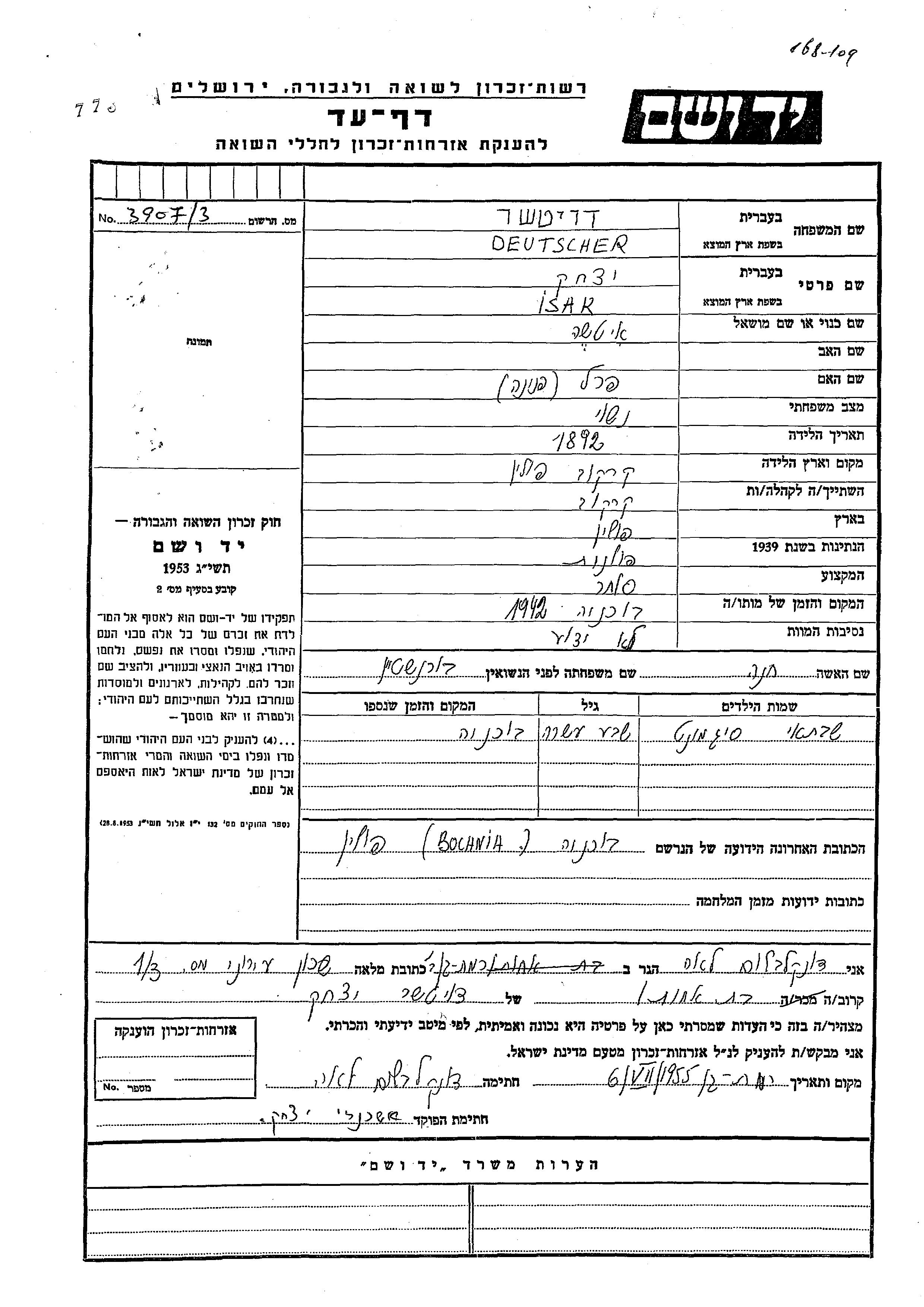 Isak Deutscher wurde im Jahr 1892 in Krakow, Polen geboren. Er war der Sohn von Yitzkhak und Perel Pnina. Er war Kaufmann/-frau und mit Khana, geb. Bornshtein Verheiratet. Vor dem Zweiten Weltkrieg lebte er in Krakow, Polen. Während des Krieges war er in Bochnia, Polen.
