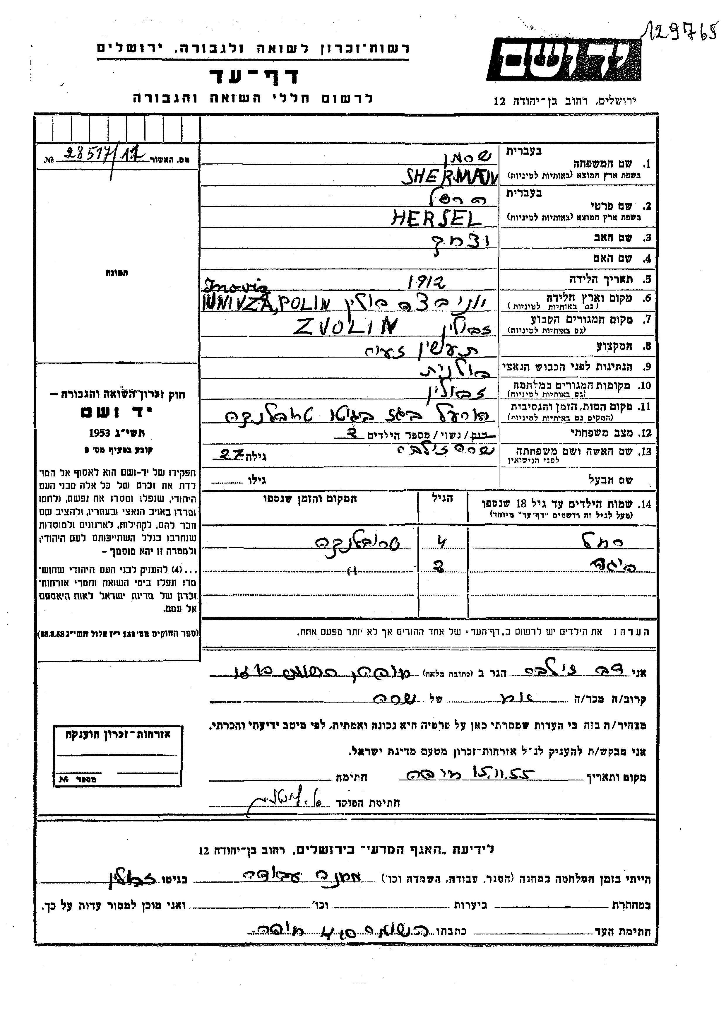 Feiga Sherman wurde Sie war die Tochter von Hersel und Sara, geb. Zilber. Sie war Kind. Vor dem Zweiten Weltkrieg lebte sie in Zvolin, Polen. Während des Krieges war sie in Zvolin, Polen.