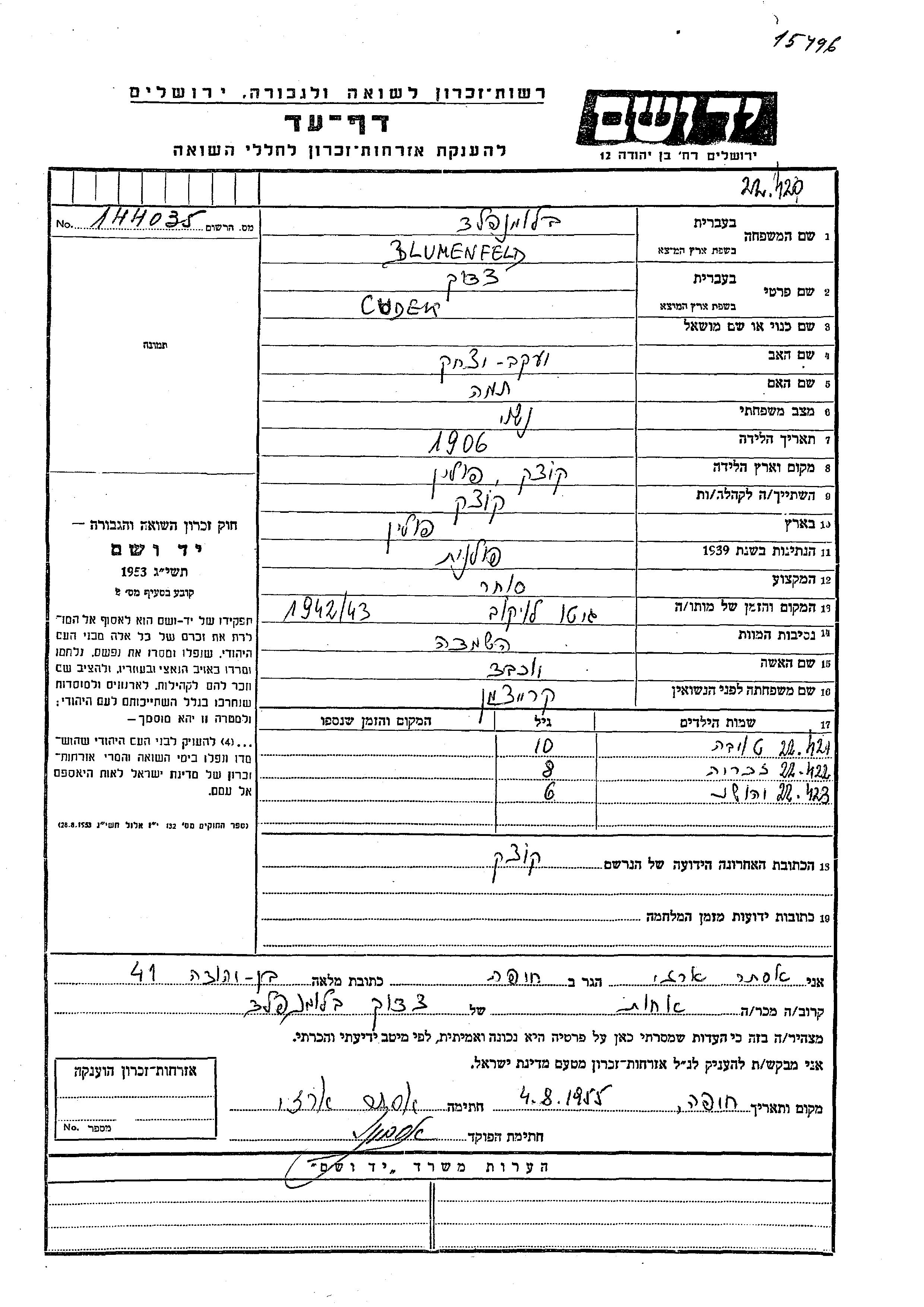 Yehoshua Blumenfeld wurde Er war der Sohn von Cudek und Yokheved, geb. Kreitzman. Er war Kind. Vor dem Zweiten Weltkrieg lebte er in Kock, Polen. Während des Krieges war er in Kock, Polen.