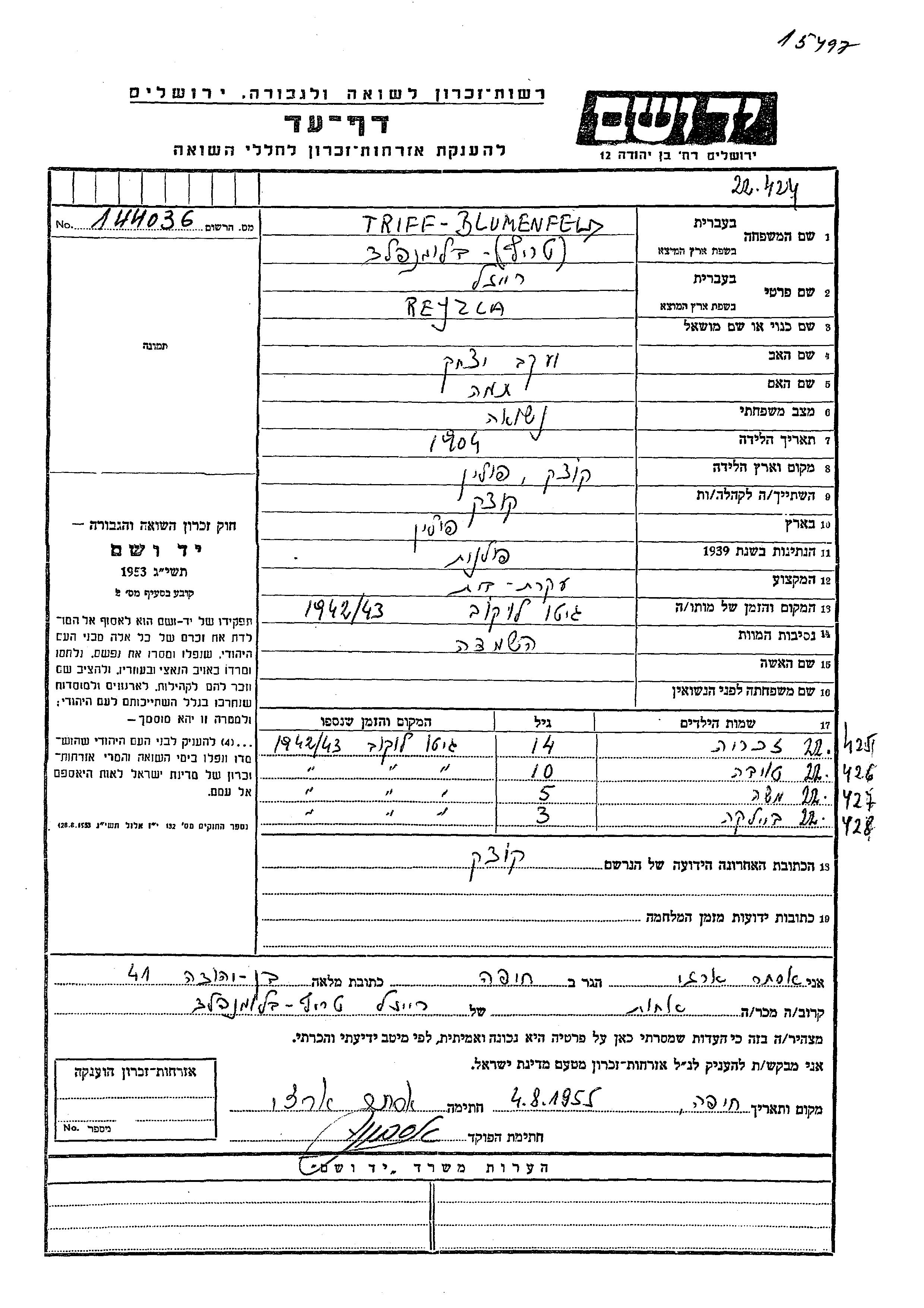 Bela Blumenfeld wurde Er/sie war der/ die Sohn/Tochter von Rejzla, geb. Triff. Er/Sie war Kind. Vor dem Zweiten Weltkrieg er/sie in Koczk, Polen.