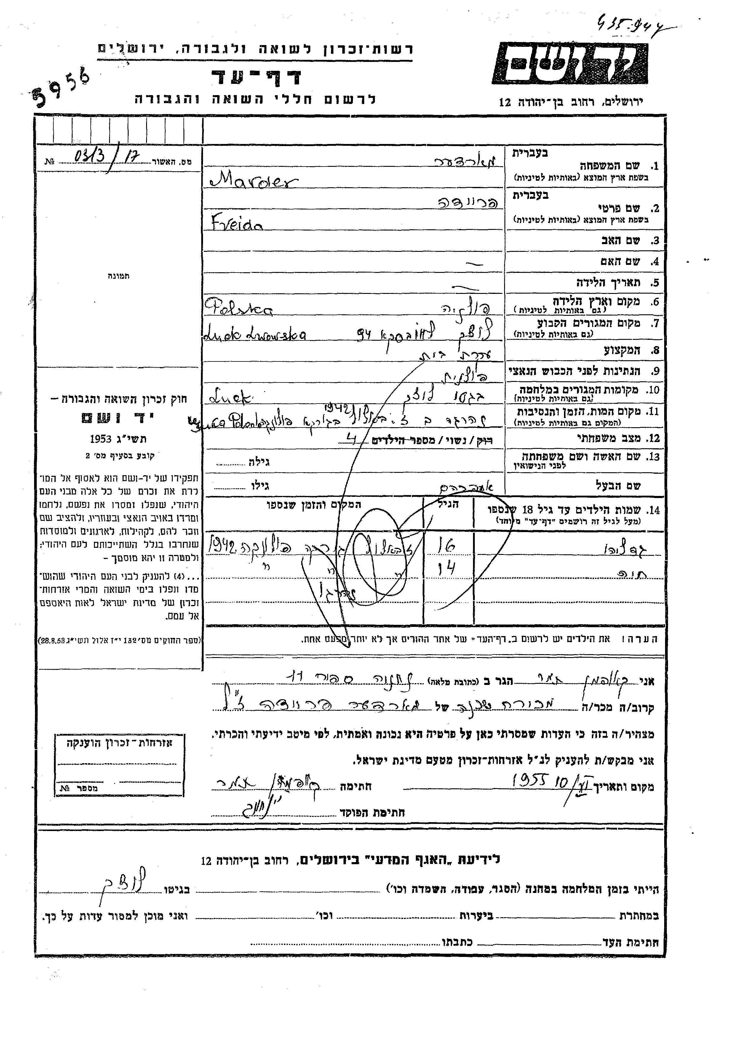 Gdaliyahu Marder wurde Er war der Sohn von Avraham und Freida. Er war Kind. Vor dem Zweiten Weltkrieg lebte er in Luck, Polen. Während des Krieges war er in Luck, Polen.