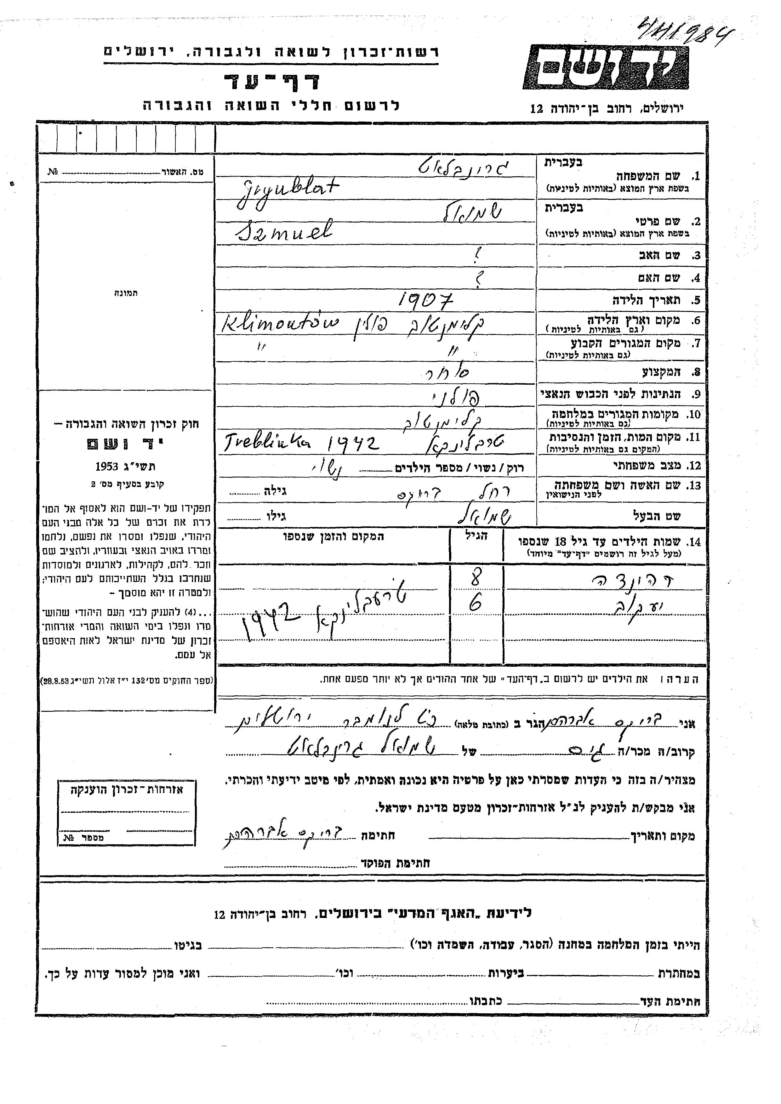 Yaakov Grynblat wurde Er war der Sohn von Szmuel und Rakhel, geb. Briks. Er war Kind. Vor dem Zweiten Weltkrieg lebte er in Klimontow, Polen. Während des Krieges war er in Klimontow, Polen.