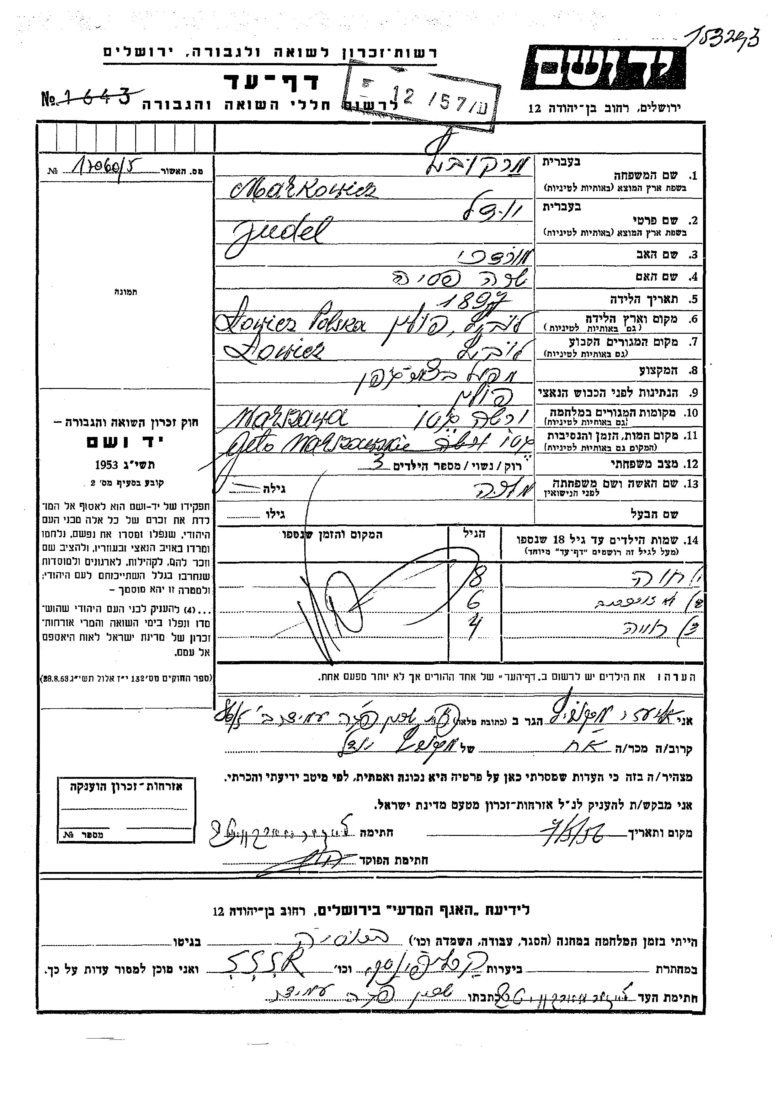 Vorname unbekannt Markowicz wurde Er/sie war der/ die Sohn/Tochter von Yudel und Malka. Er/Sie war Kind. Vor dem Zweiten Weltkrieg er/sie in Lowicz, Polen. Während des Krieges war er/sie in Warszawa, Polen.