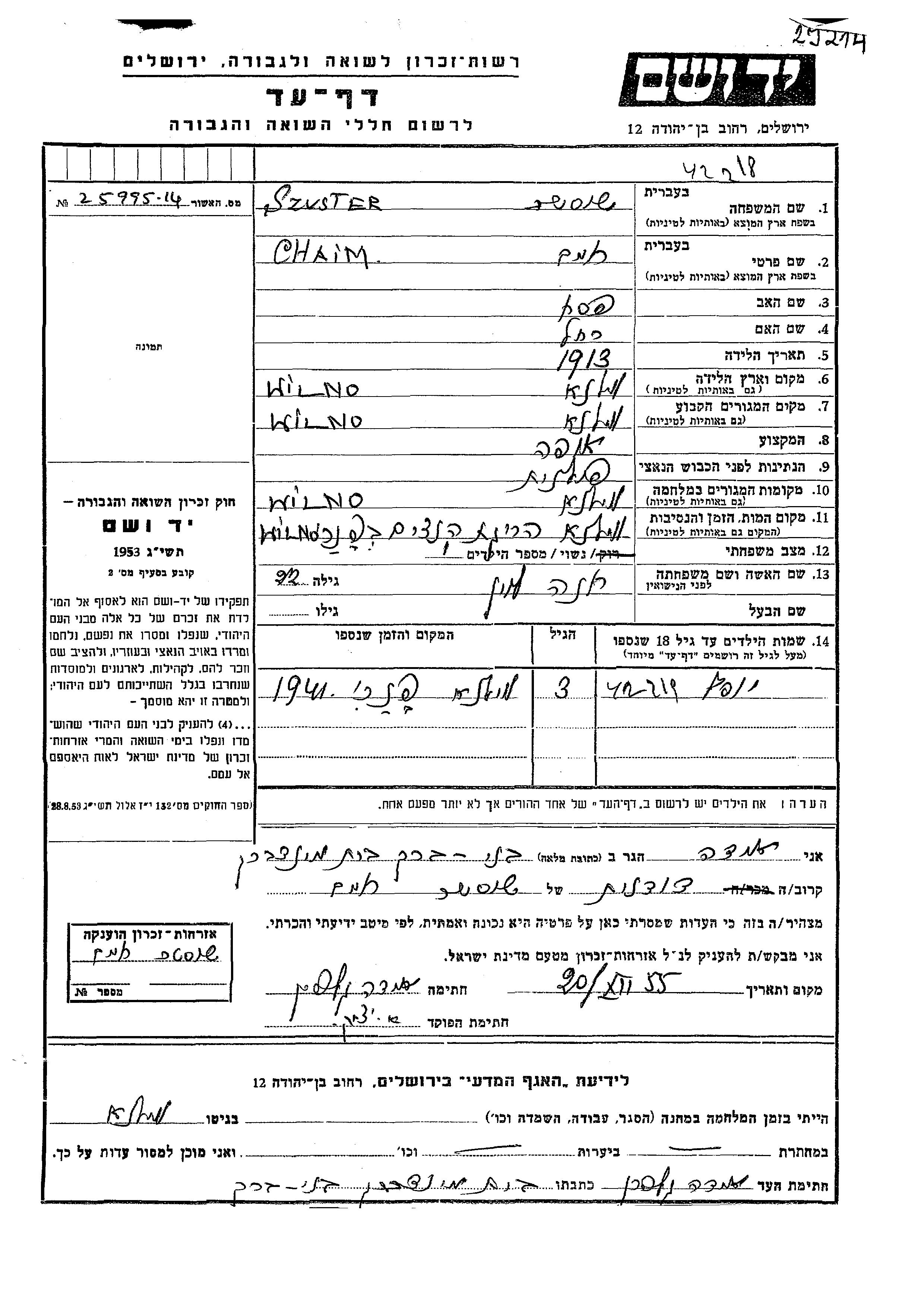 Yosef Szuster wurde Er war der Sohn von Chaim und Khana, geb. Levin. Er war Kind. Vor dem Zweiten Weltkrieg lebte er in Wilno, Polen. Während des Krieges war er in Wilno, Polen.