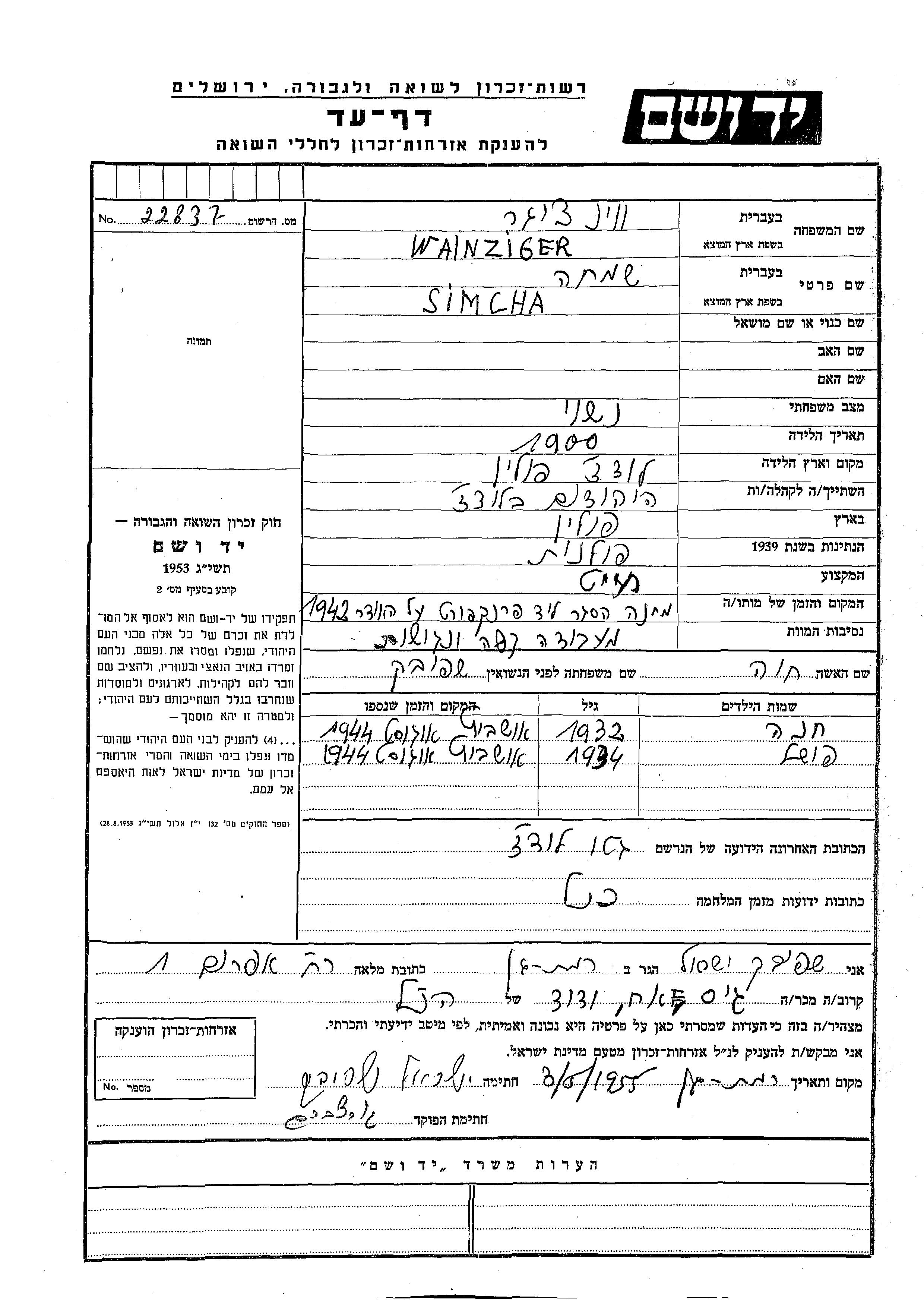 Khana Wainziger wurde im Jahr 1932 geboren. Sie war die Tochter von Simcha und Khava, geb. Shpivak. Sie war Kind. Vor dem Zweiten Weltkrieg lebte sie in Lodz, Polen. Während des Krieges war sie in Lodz, Polen.
