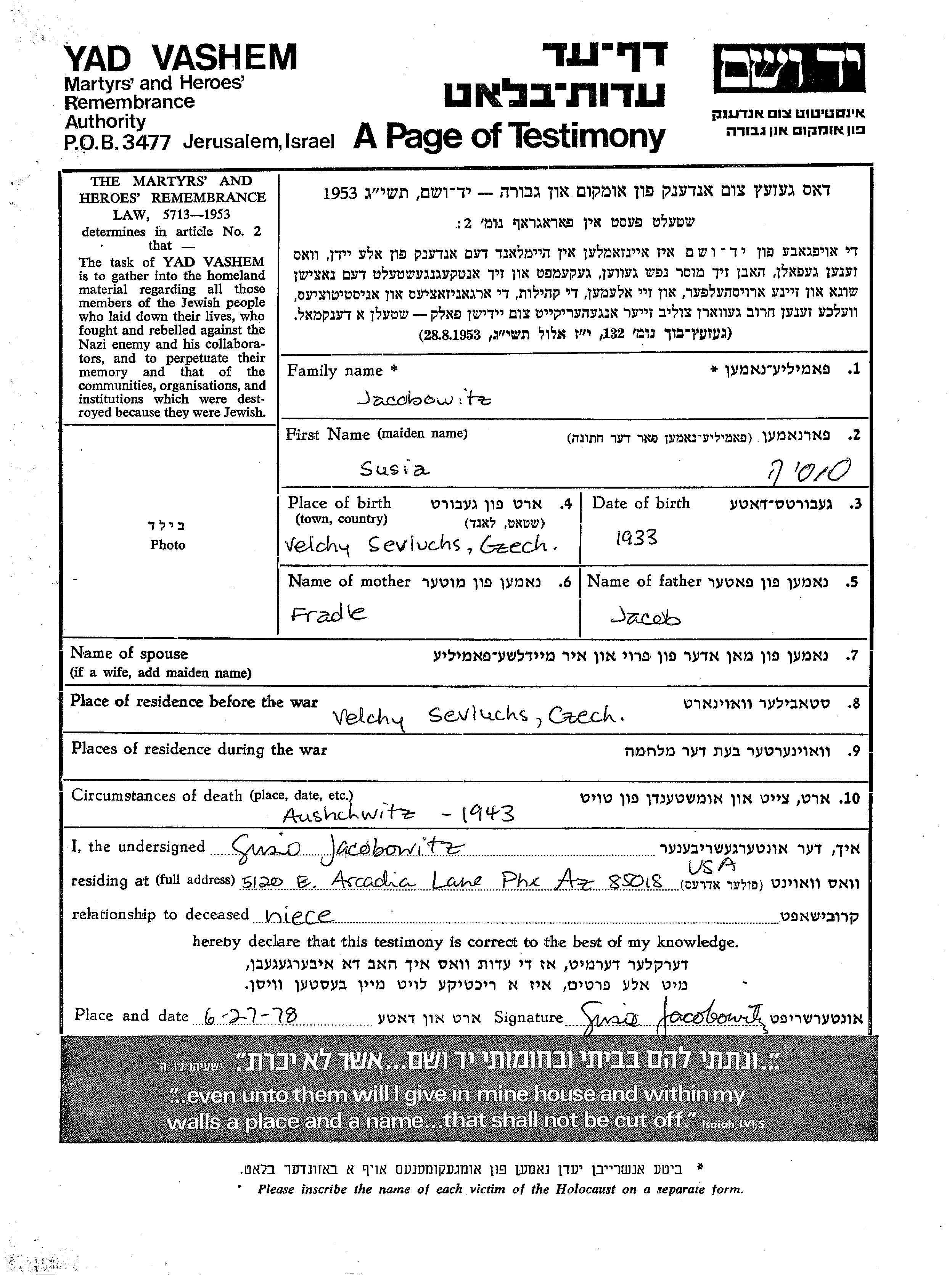 Jacobowitz Susia 1933 Velky Sevlus, Tschechoslowakei Gedenkblatt