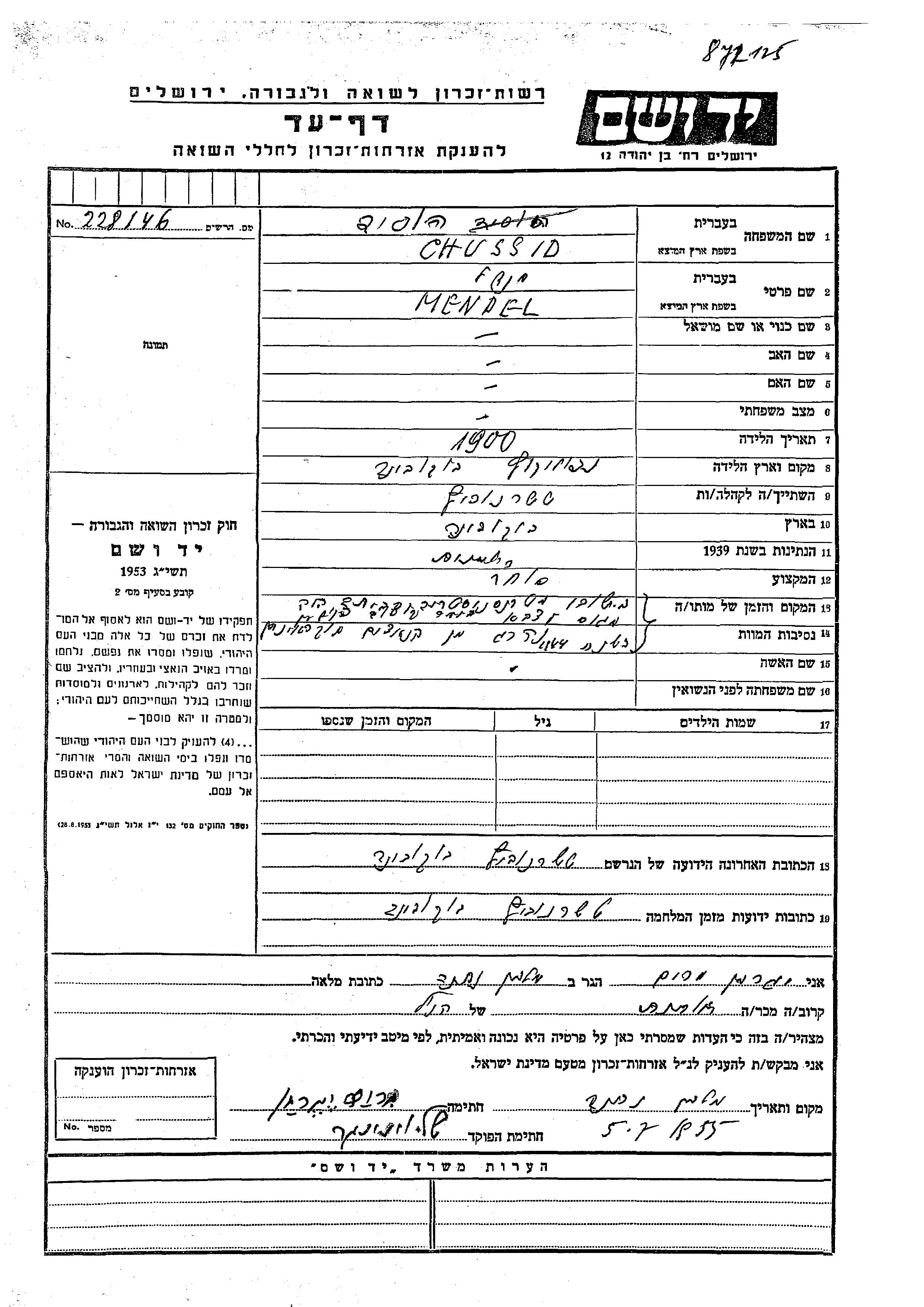 Mendel Chussid wurde im Jahr 1900 in Cernauti, Rumänien geboren. Er war Kaufmann/-frau. Vor dem Zweiten Weltkrieg lebte er in Cernauti, Rumänien. Während des Krieges war er in Cernauti, Rumänien.