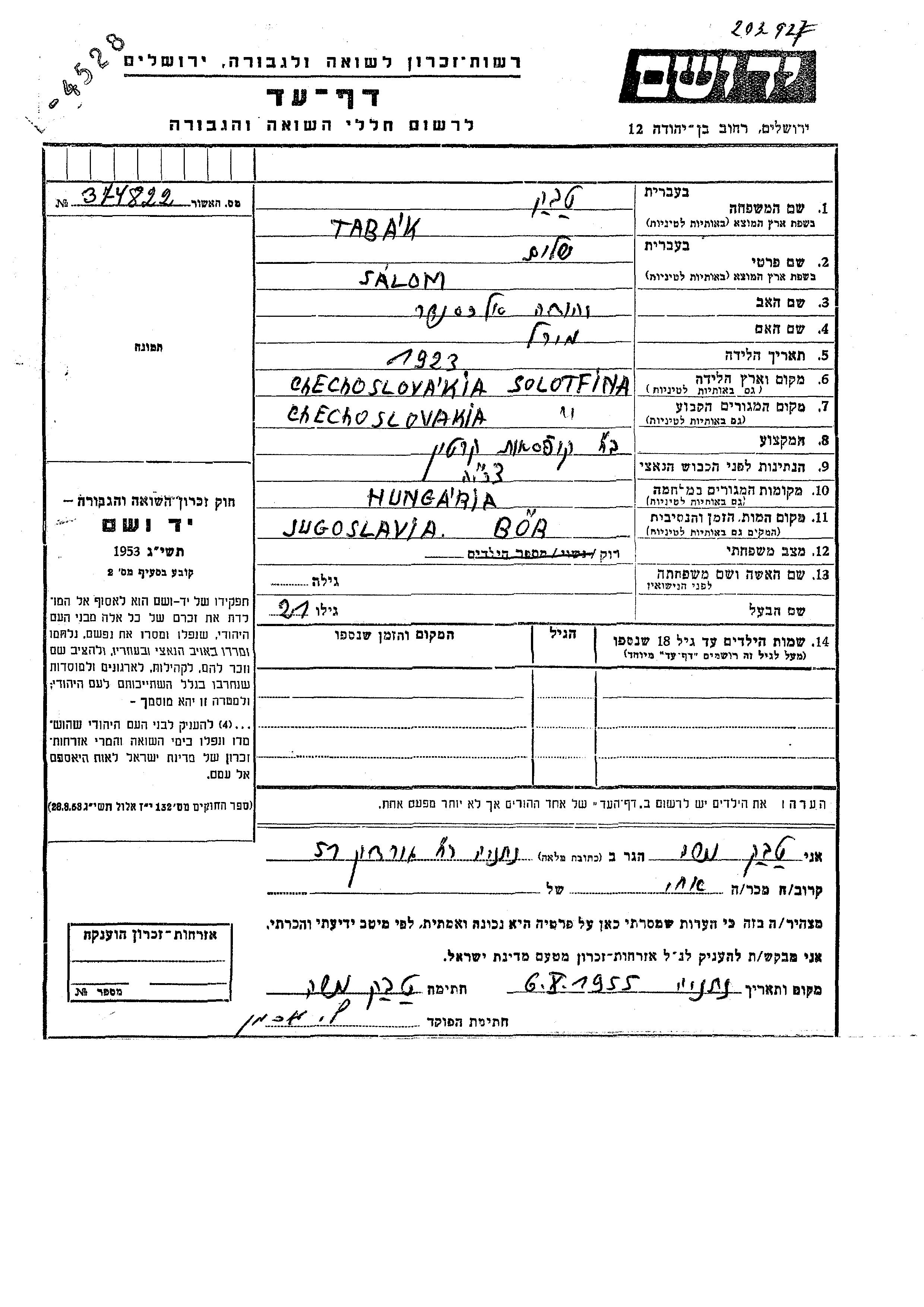 Shalom Tabak wurde im Jahr 1923 in Solotvina, Tschechoslowakei geboren. Er war der Sohn von Yehuda Aleksander und Mirl. Er war בית חרושת לקופסאות קרטון und Ledig. Vor dem Zweiten Weltkrieg lebte er in Solotvina, Tschechoslowakei. Während des Krieges war er in Ungarn.