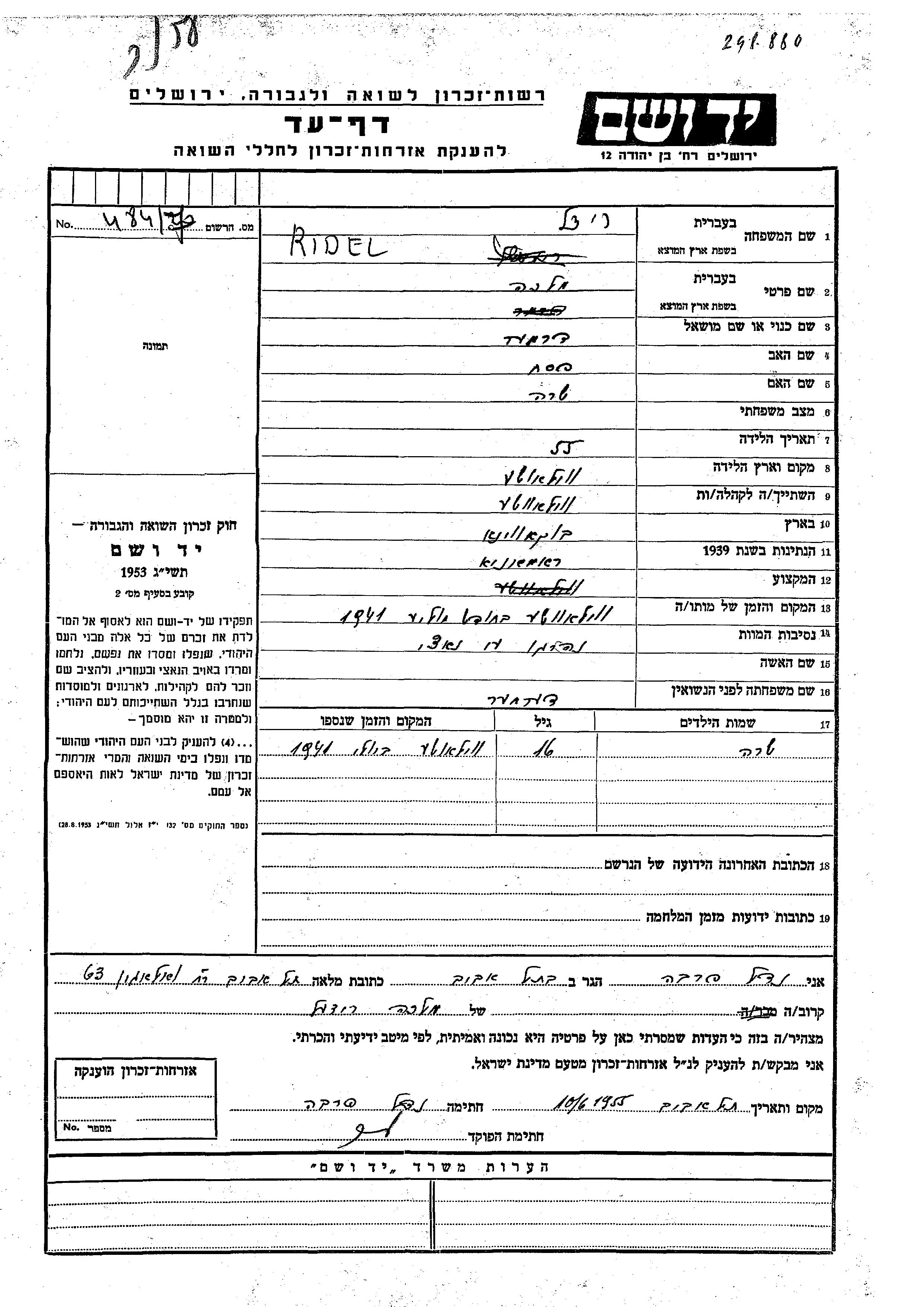Sara Ridel wurde Sie war die Tochter von Malka, geb. Darmer. Sie war Jugendliche/-r. Vor dem Zweiten Weltkrieg lebte sie in Vilaucea, Rumänien. Während des Krieges war sie in Vilaucea, Rumänien.