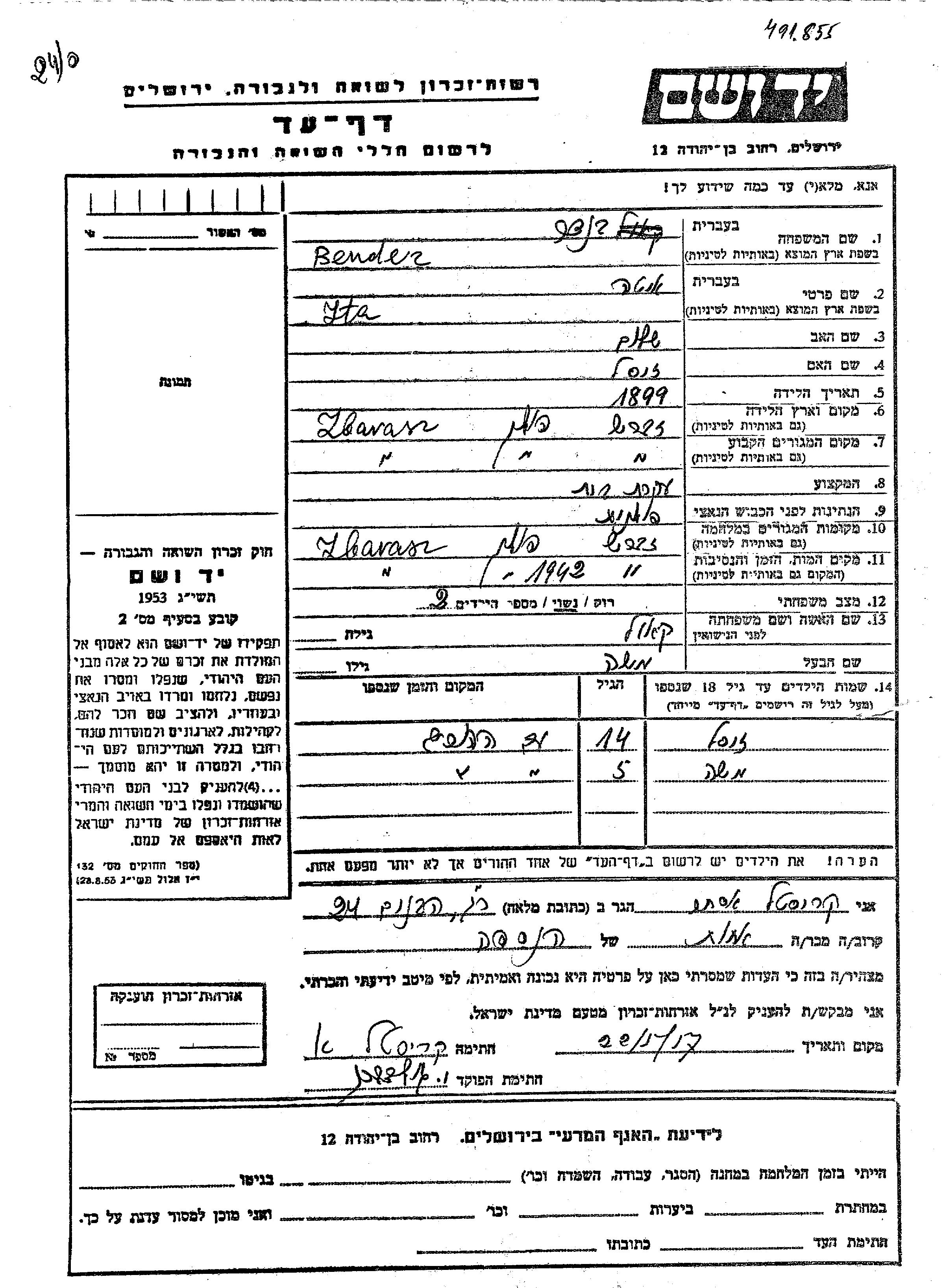 Moshe Bender wurde Er war der Sohn von Moshe und Ita, geb. Kaul. Er war Kind. Vor dem Zweiten Weltkrieg lebte er in Zbaraz, Polen. Während des Krieges war er in Zbaraz, Polen.