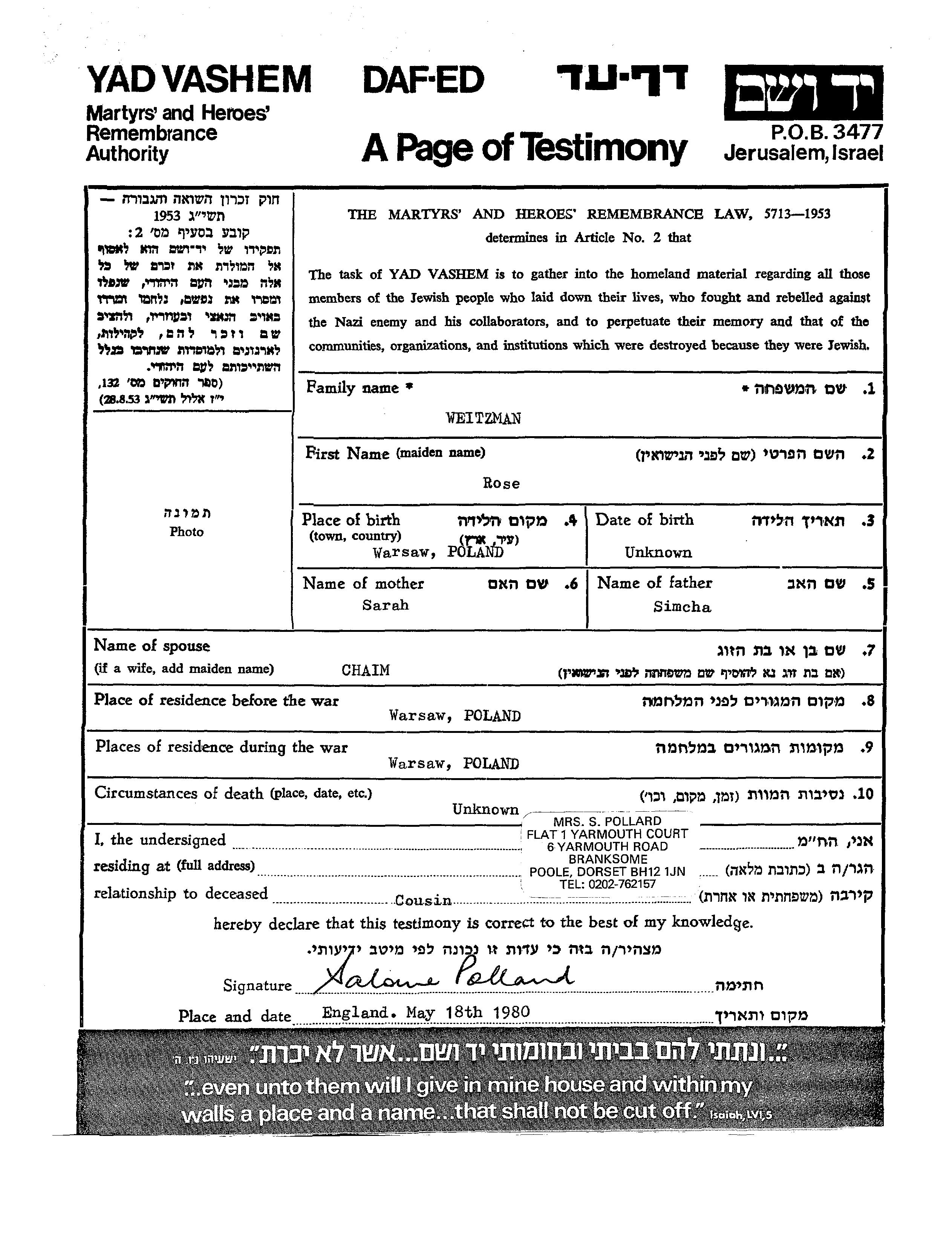 Rose Weitzman wurde in Warsaw, Polen geboren. Sie war die Tochter von Simcha und Sarah. Vor dem Zweiten Weltkrieg lebte sie in Warsaw, Polen. Während des Krieges war sie in Warsaw, Polen.