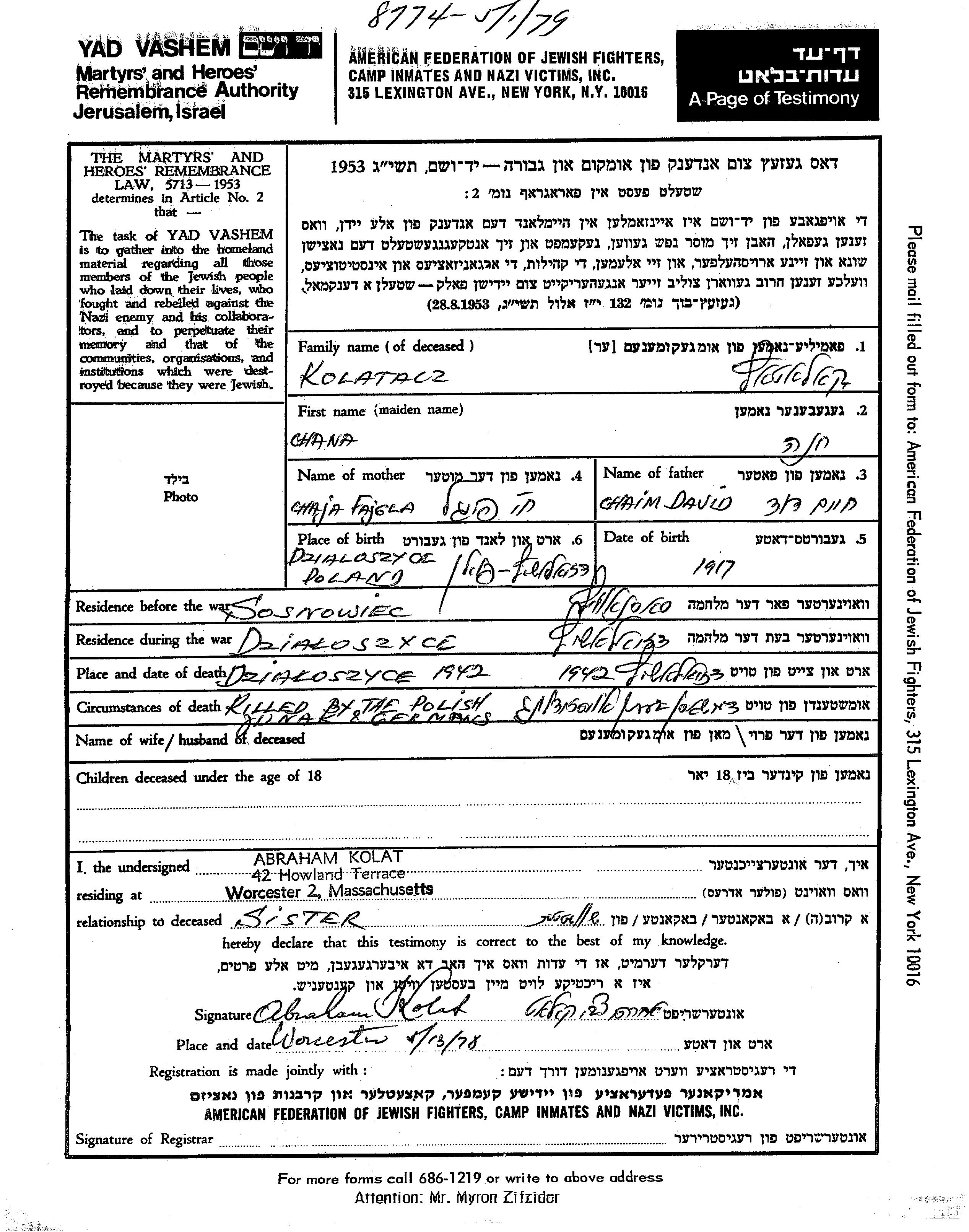 Chana Kolatacz wurde im Jahr 1917 in Dzialoszyce, Polen geboren. Sie war die Tochter von Chaim David und Chaja Fajgla Khai. Sie war Ledig. Vor dem Zweiten Weltkrieg lebte sie in Sosnowiec, Polen. Während des Krieges war sie in Dzialoszice, Polen.