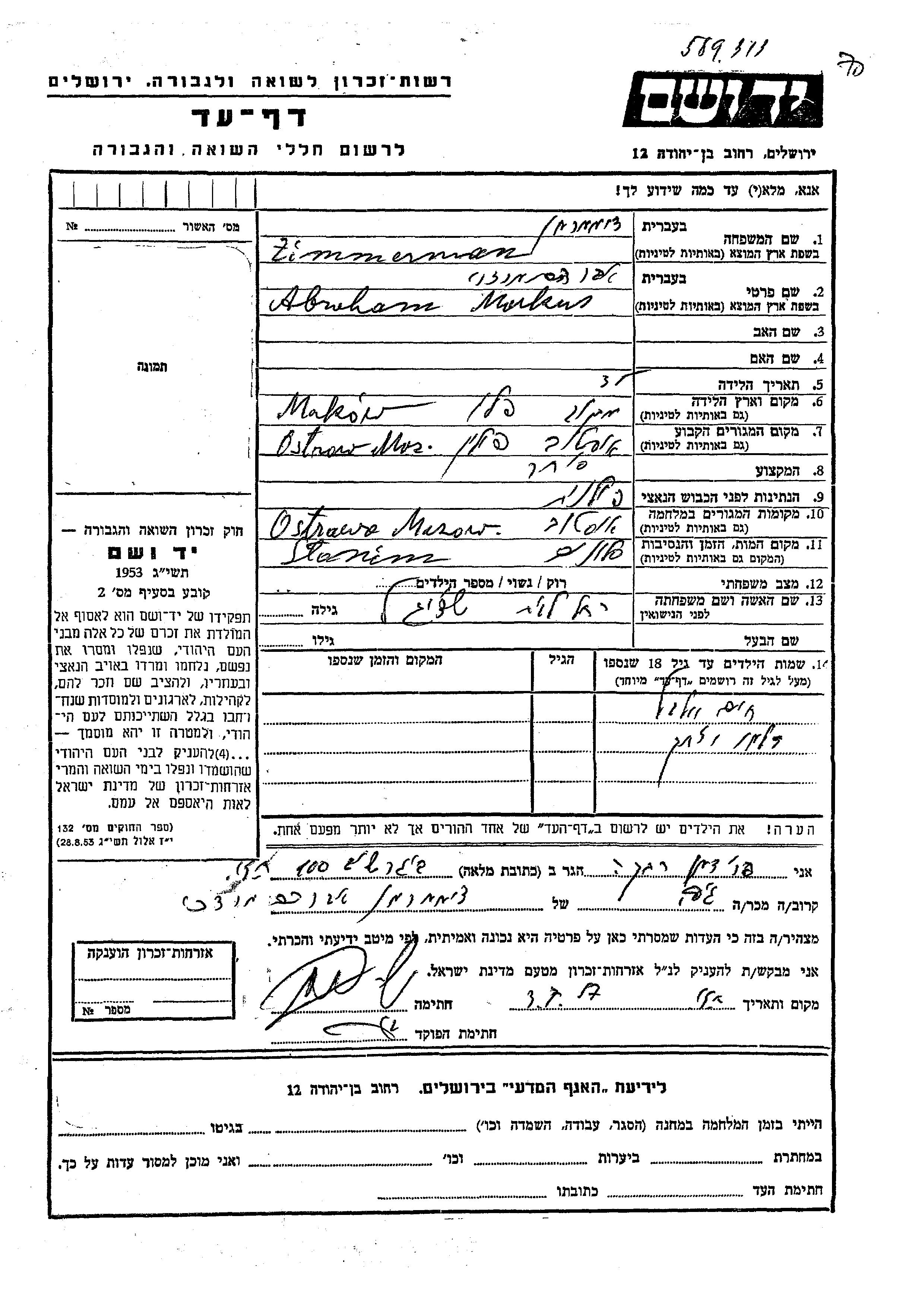 Khaim Volf Zimmerman wurde Er war der Sohn von Abraham Mordekhai Markus und Rakhel Lea, geb. Shpigel. Er war Kind. Vor dem Zweiten Weltkrieg lebte er in Ostrów Mazowiecka, Polen. Während des Krieges war er in Ostrów Mazowiecka, Polen.