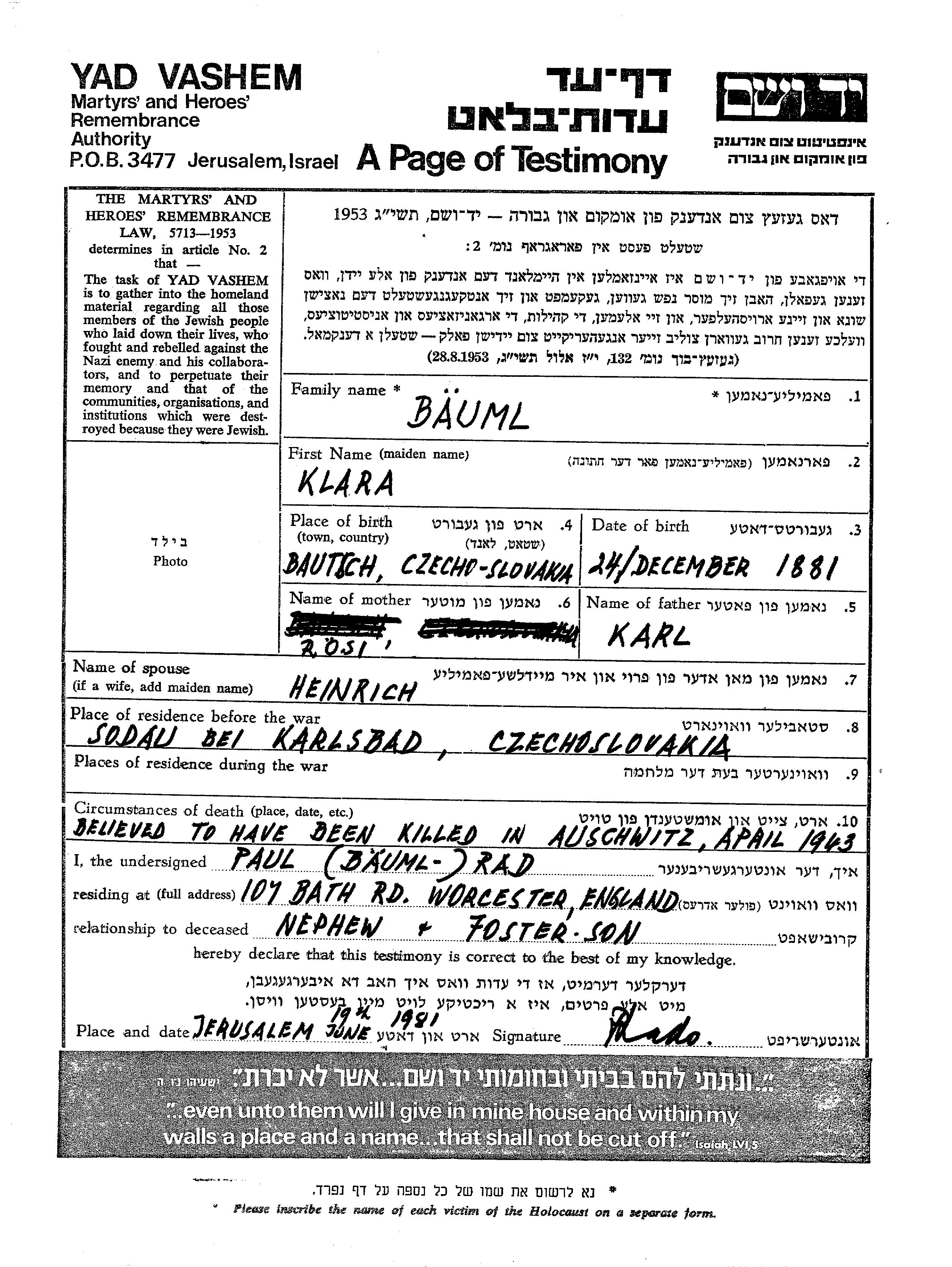 Klara Baeuml wurde im Jahr 1881 in Bautsch, Tschechoslowakei geboren. Sie war die Tochter von Karl und Rösi. Sie war mit Heinrich Verheiratet. Vor dem Zweiten Weltkrieg lebte sie in Sodau, Tschechoslowakei.