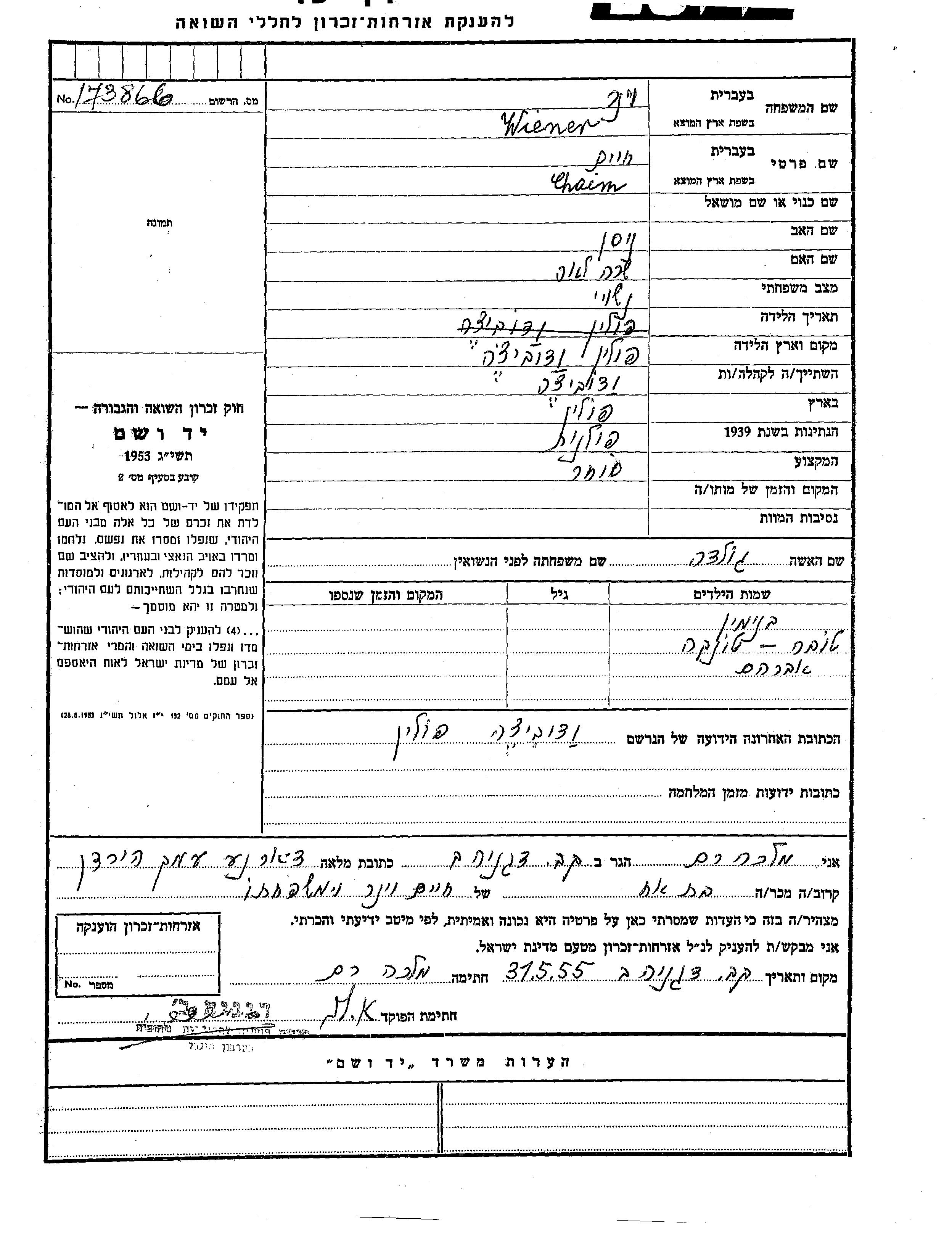 Beniamin Wiener wurde Er war der Sohn von Chaim und Golda. Er war Kind. Vor dem Zweiten Weltkrieg lebte er in Wadowice, Polen.