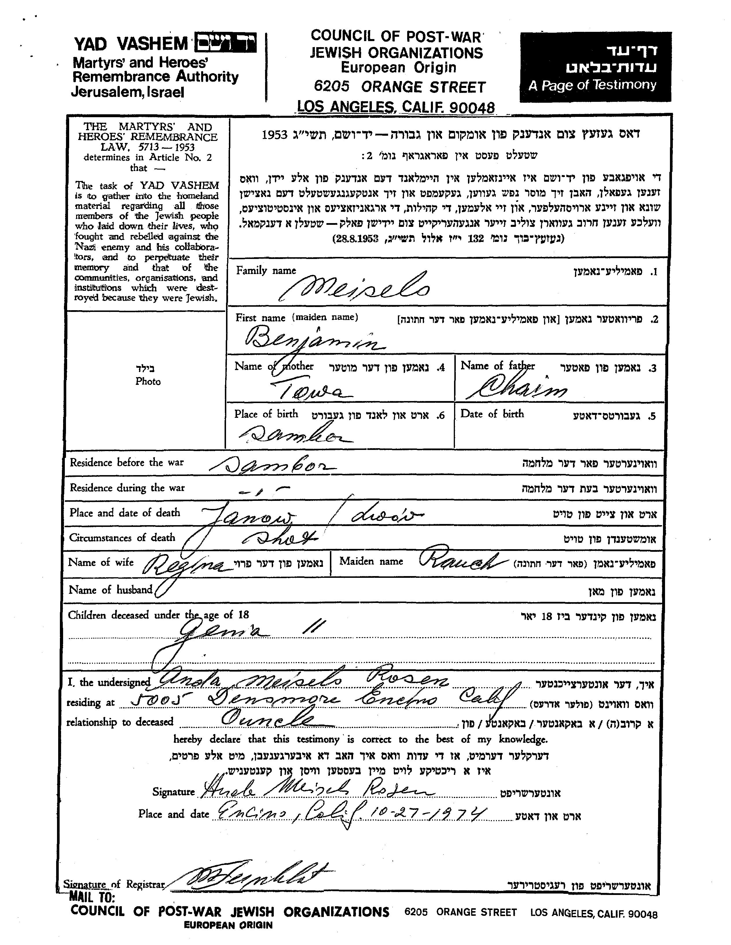 Genia Meisels wurde Sie war die Tochter von Benjamin und Regina, geb. Rauch. Sie war Kind. Vor dem Zweiten Weltkrieg lebte sie in Samber, Polen. Während des Krieges war sie in Samber, Polen.