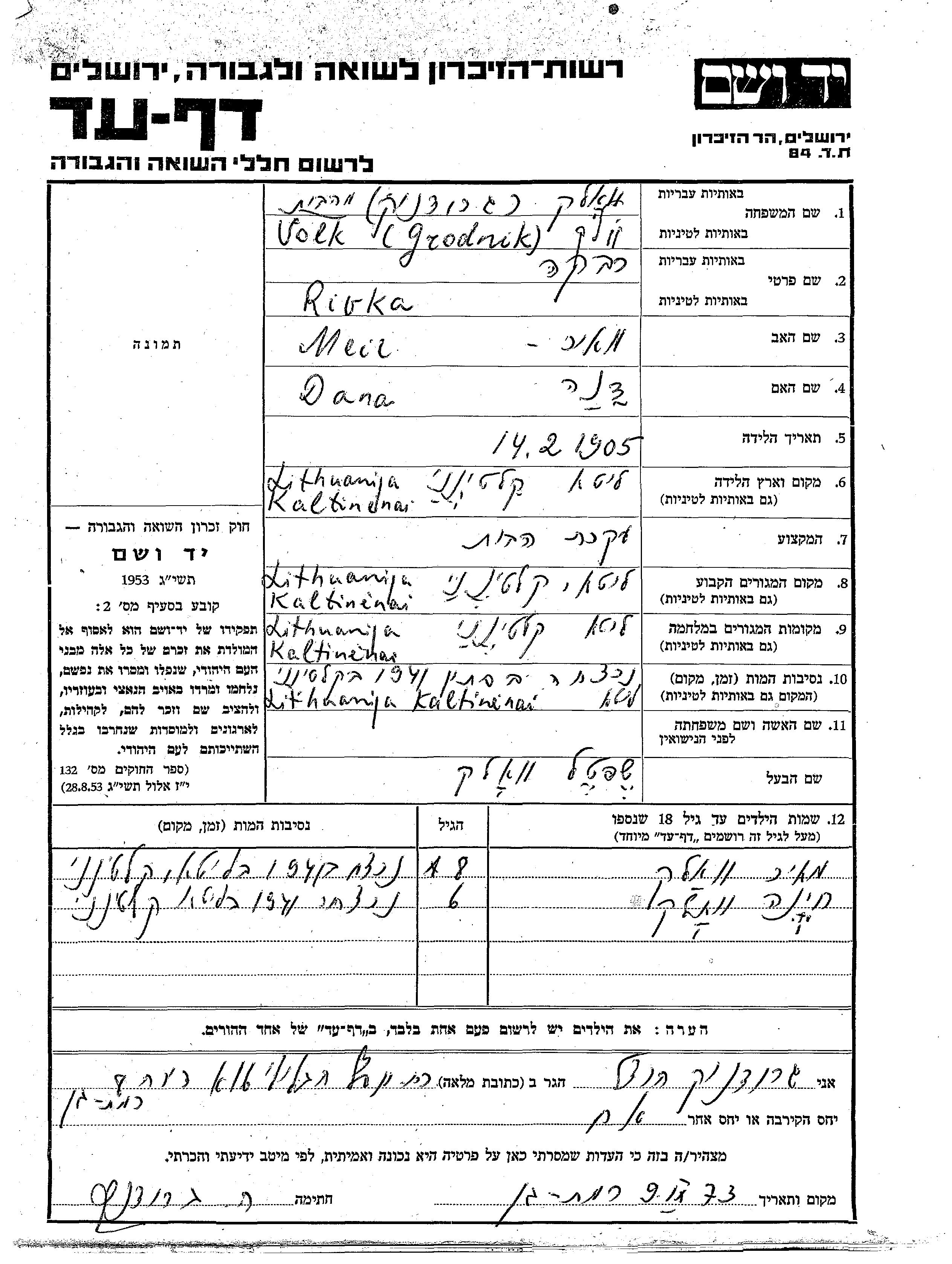 Meir Volk Volak wurde Er war der Sohn von Shabtai und Rivka, geb. Grodnik. Er war Kind. Vor dem Zweiten Weltkrieg lebte er in Kaltinenai, Litauen. Während des Krieges war er in Kaltinenai, Litauen.