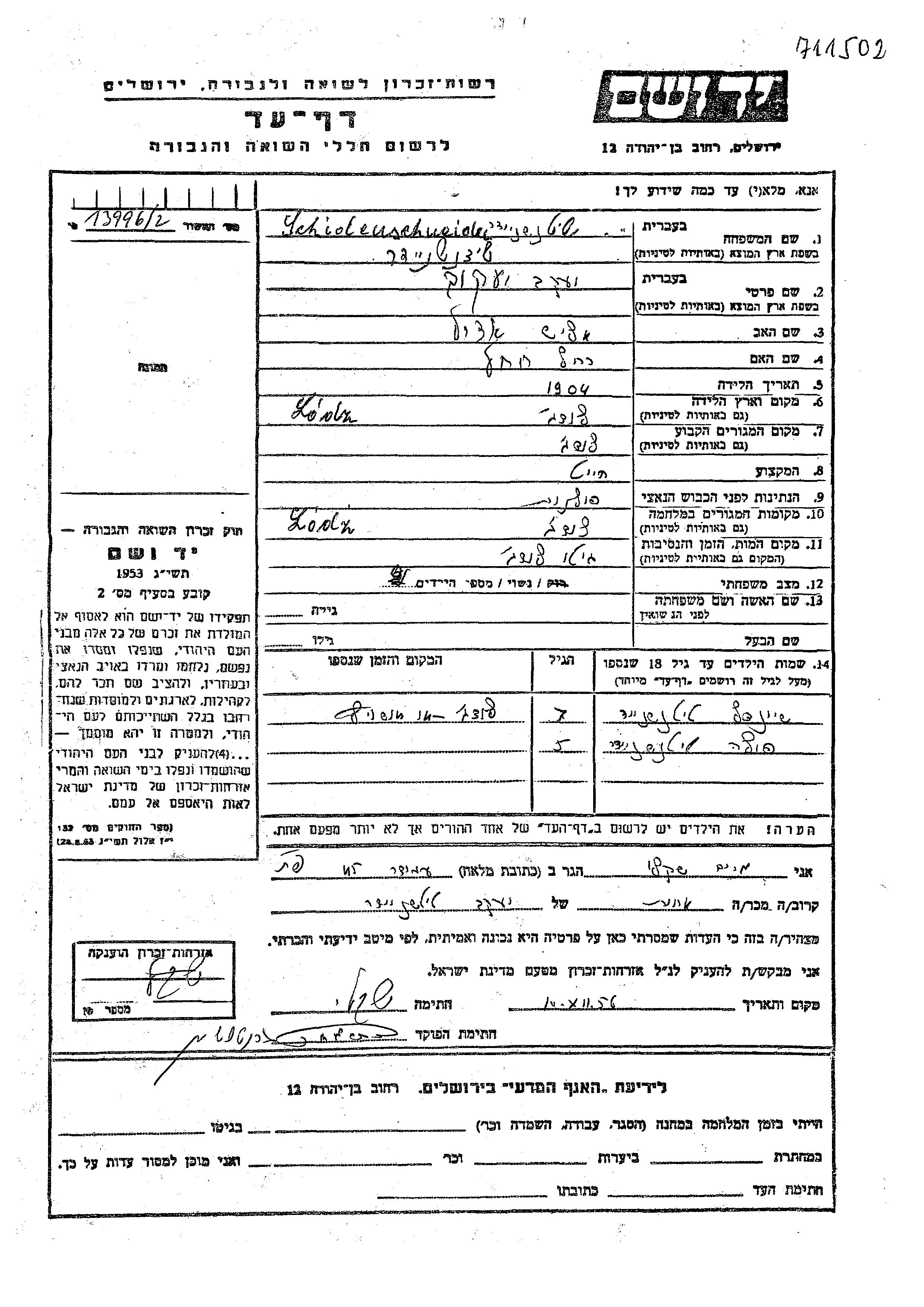 Sheindl Schidenschneider was born to Yaakov. She was child. Prior to WWII she lived in Lodz, Polen. During the war she was in Lodz, Polen.