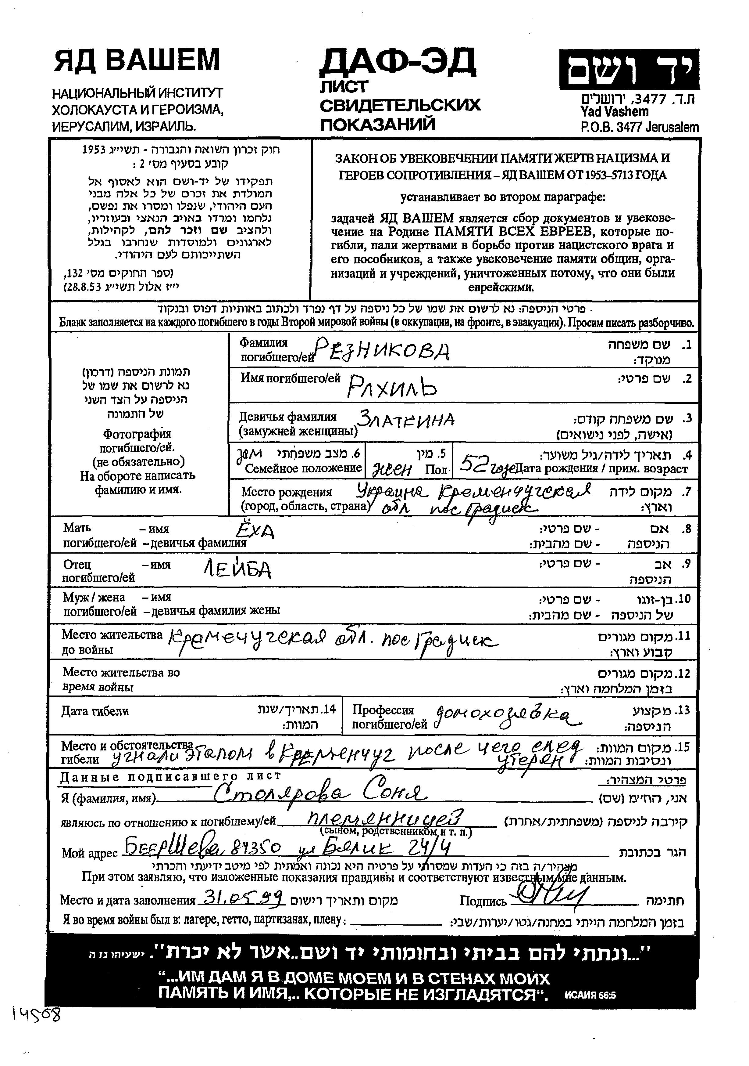 Rachil Reznikova, geb. Zlatkin wurde in Gradizk, Ukraine (UdSSR) geboren. Sie war die Tochter von Leiba und Yocha. Sie war Hausfrau und Verheiratet. Vor dem Zweiten Weltkrieg lebte sie in Gradizk, Ukraine (UdSSR).