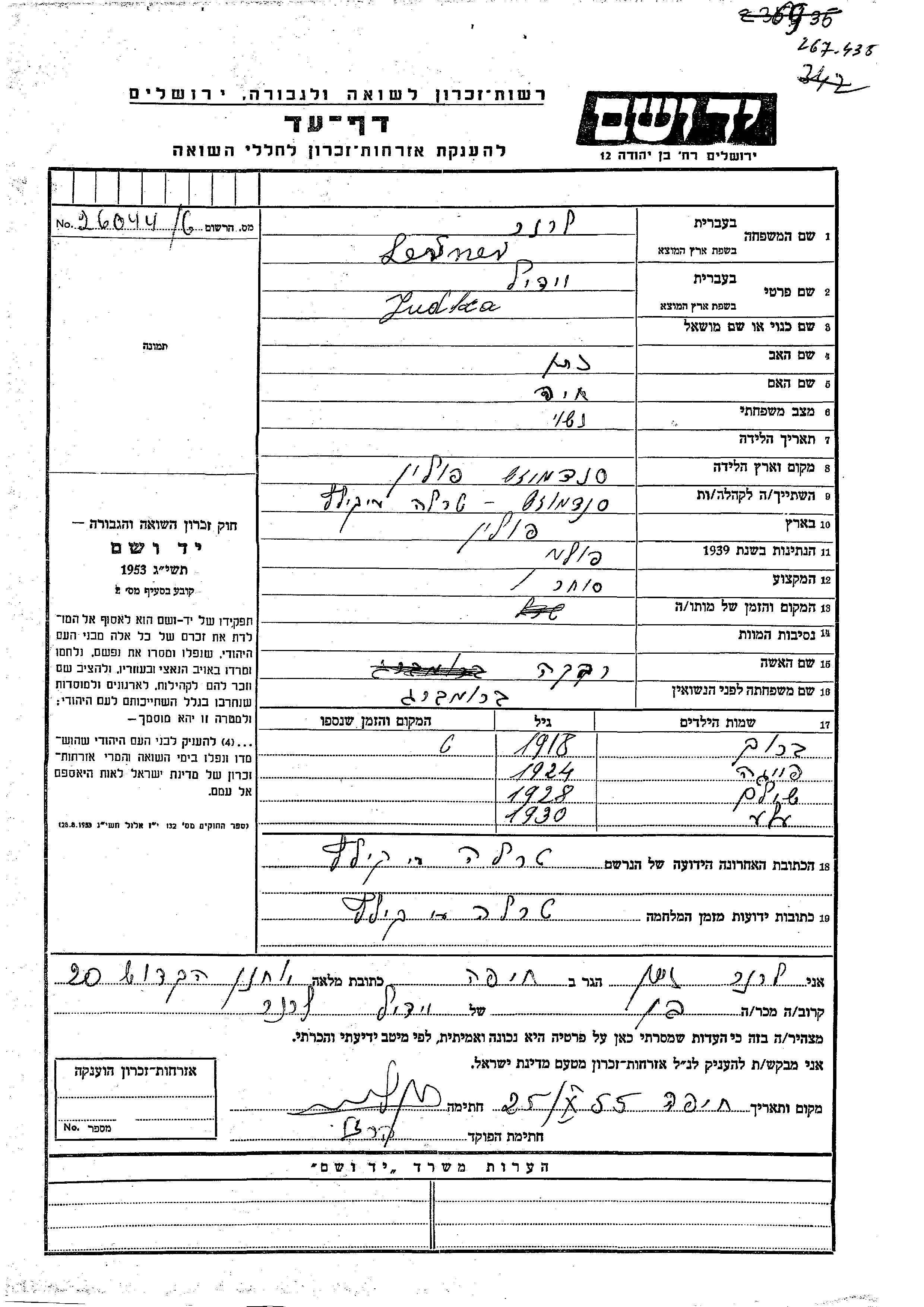 Barukh Lerner wurde im Jahr 1918 geboren. Er war der Sohn von Rivka und Judka, geb. Bromberg. Vor dem Zweiten Weltkrieg lebte er in Sandomierz, Polen. Während des Krieges war er in Tarle, Polen.