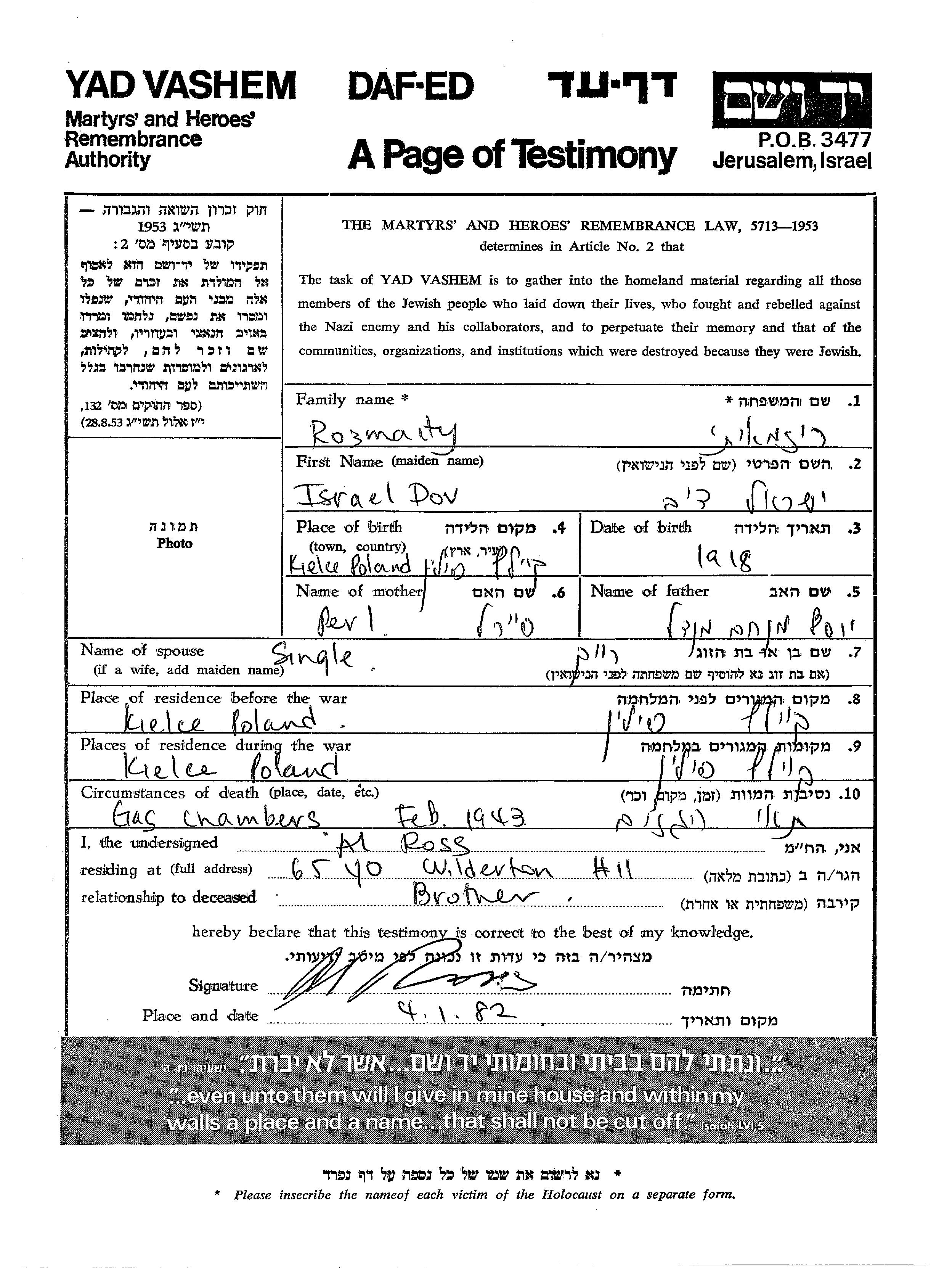 Rozmaity Israel Dov 1918 Kielce, Polen Gedenkblatt