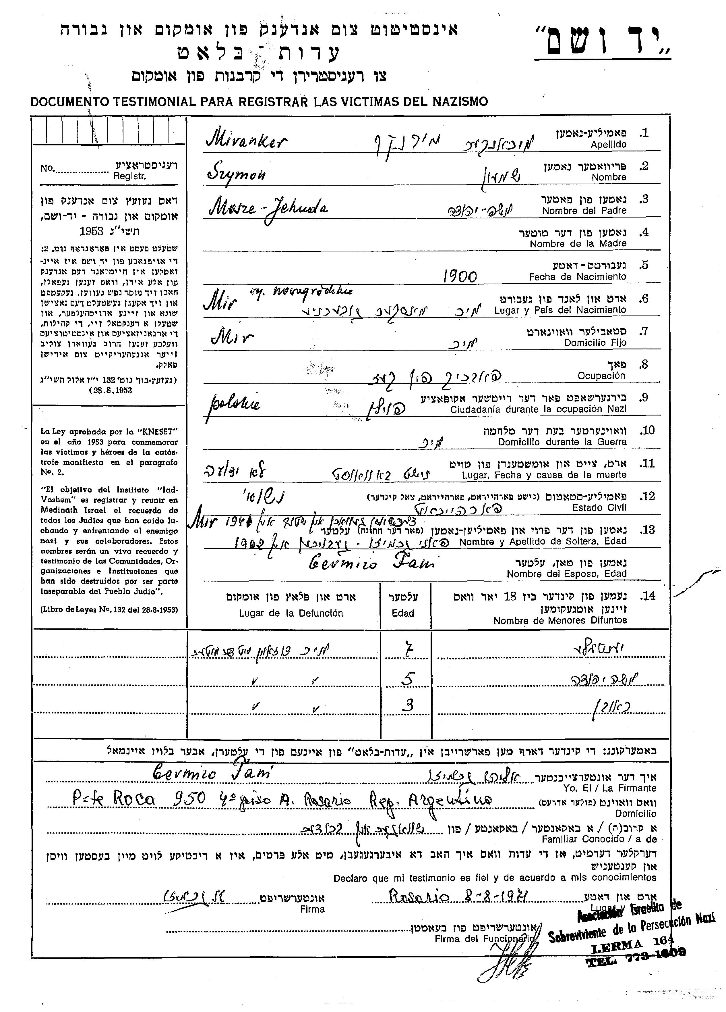 Reuven Miranker wurde Er war der Sohn von Szymon und Fani, geb. Germizo. Er war Kind. Vor dem Zweiten Weltkrieg lebte er in Mir, Polen. Während des Krieges war er in Mir, Polen.
