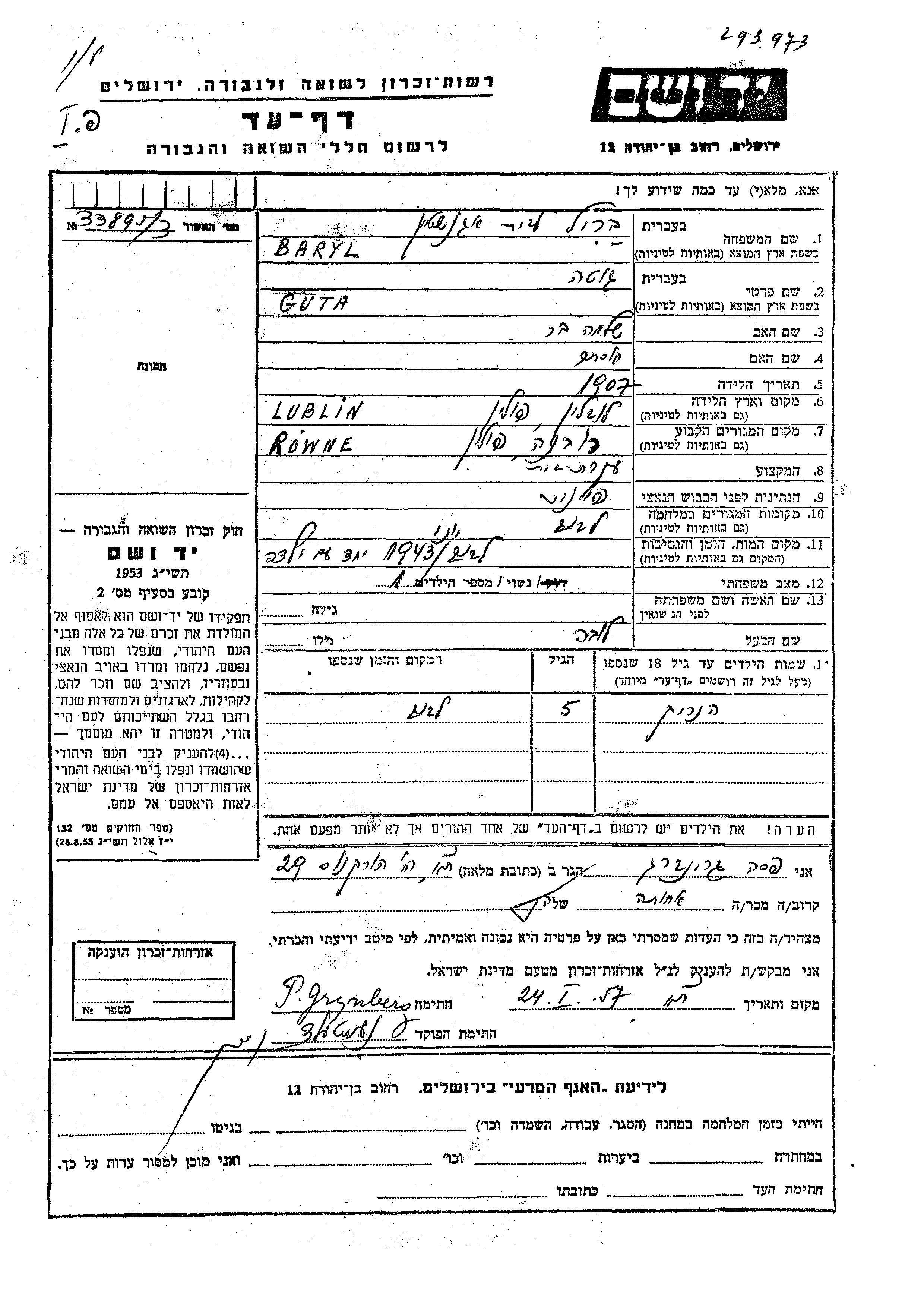Henrikh Baryl Bril wurde Er war der Sohn von Lova und Guta, geb. Agenshtein. Er war Kind. Vor dem Zweiten Weltkrieg lebte er in Rowna, Polen. Während des Krieges war er in Lwow, Polen.
