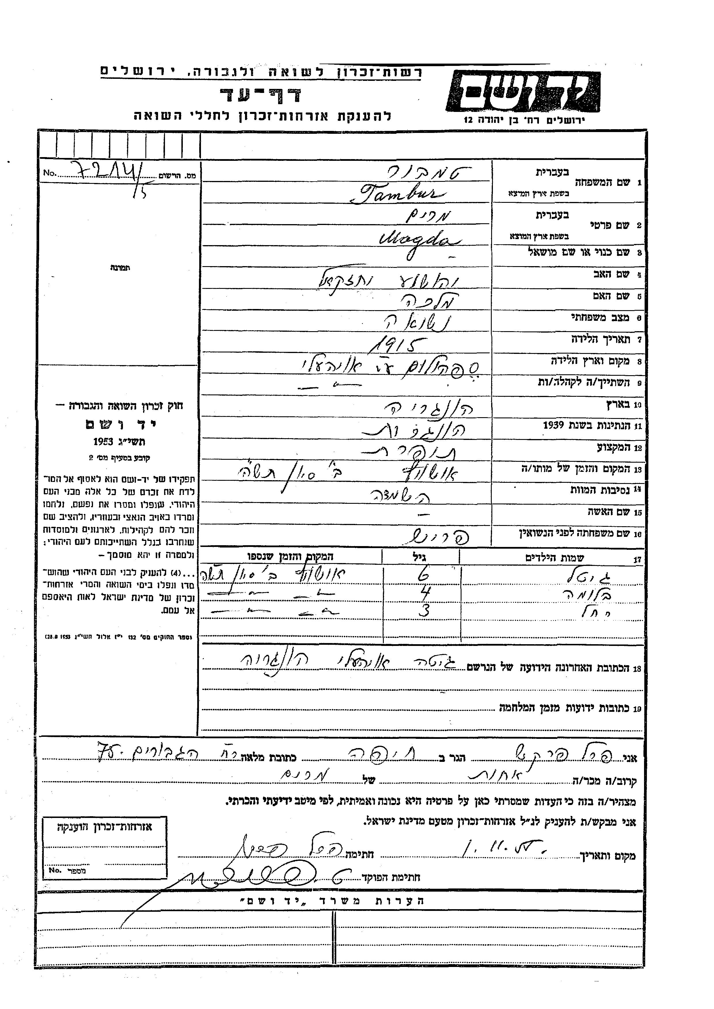 Gitel Tambur wurde Sie war die Tochter von Magda Miriam, geb. Frish. Sie war Kind. Vor dem Zweiten Weltkrieg lebte sie in Szephalom, Ungarn.