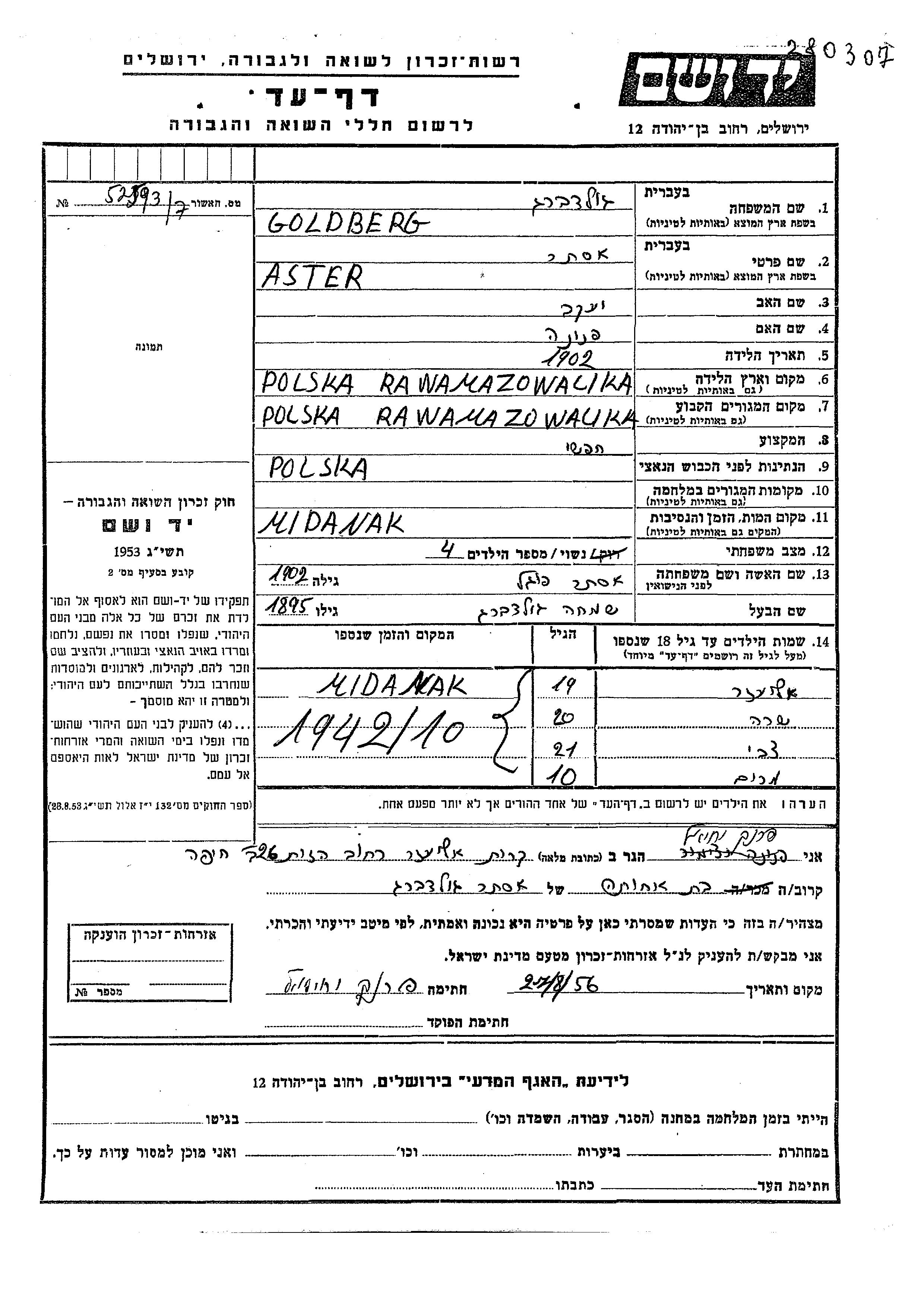 Eliezer Goldberg wurde Er war der Sohn von Simkha und Ester, geb. Fogel. Vor dem Zweiten Weltkrieg lebte er in Rawa Mazowiecka, Polen.