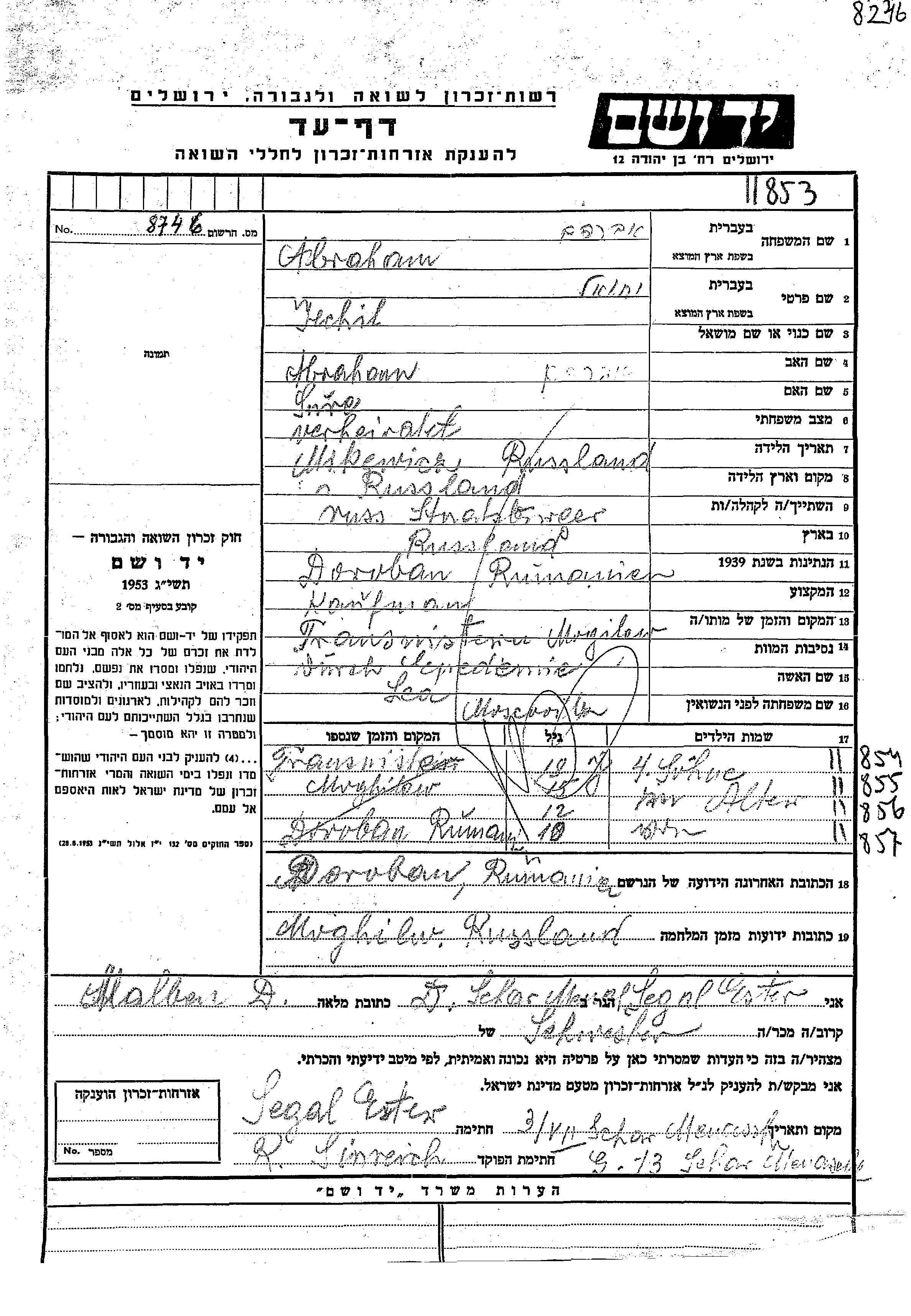 Vorname unbekannt Abraham wurde Er/sie war der/ die Sohn/Tochter von Yechil und Lea, geb. Moscovic. Vor dem Zweiten Weltkrieg er/sie in Darabani, Rumänien. Während des Krieges war er/sie in Mogilev Podolski, Ukraine (UdSSR).