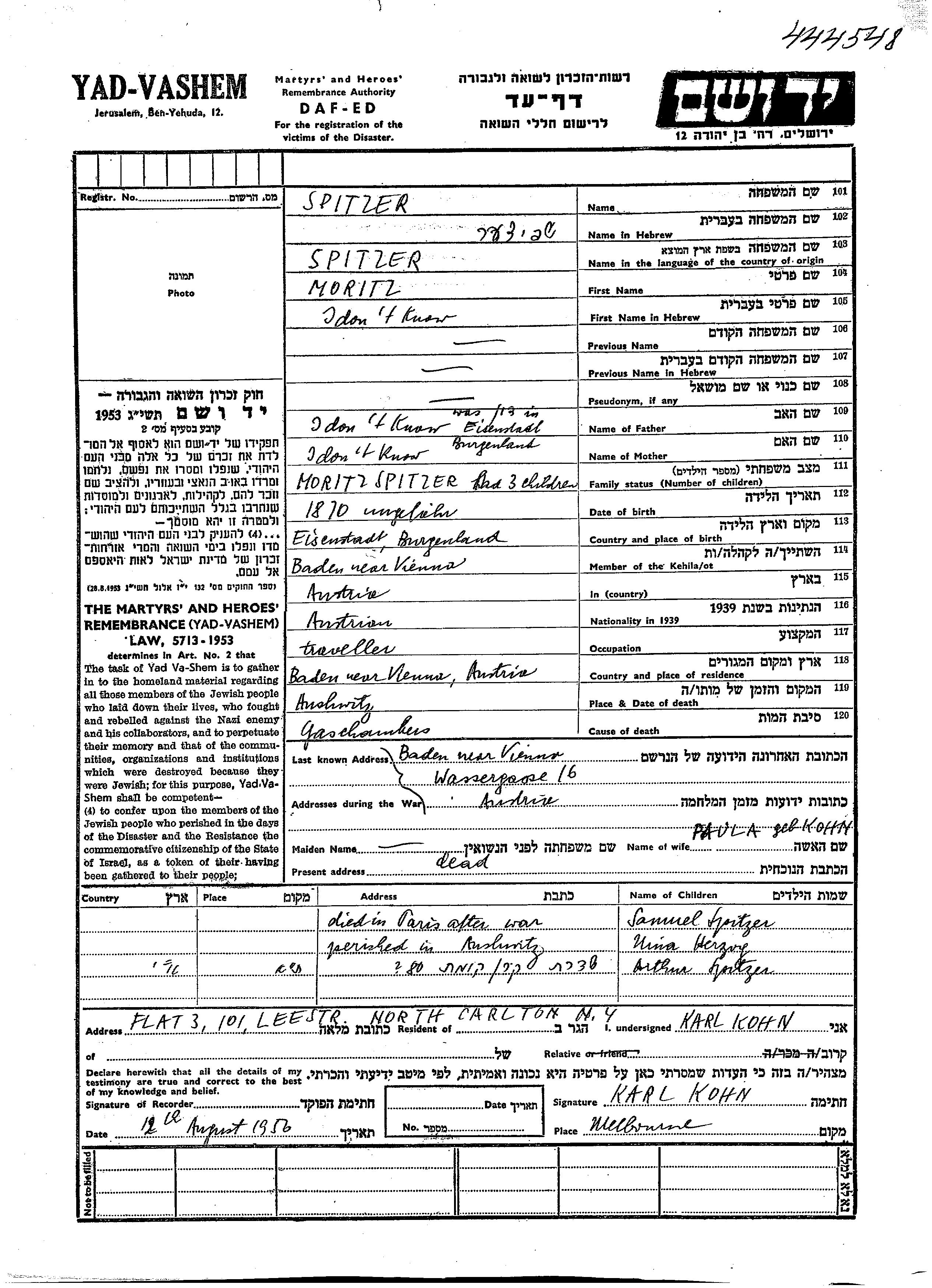 Samuel Spitzer wurde Er war der Sohn von Moritz und Paula, geb. Kohn. Er war Kind. Vor dem Zweiten Weltkrieg lebte er in Baden, Österreich. Während des Krieges war er in Österreich.