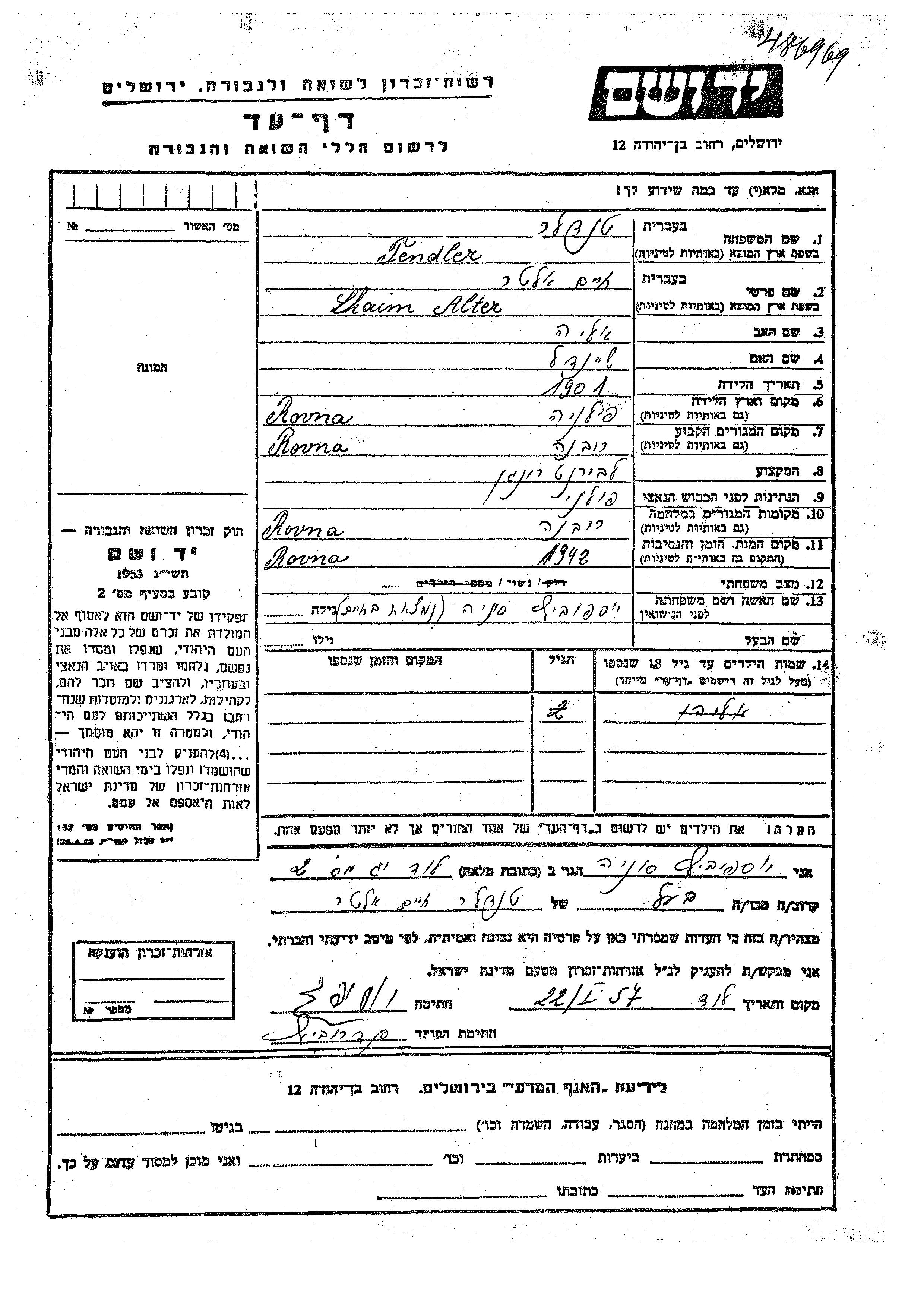 Eliahu Tendler wurde Er war der Sohn von Chaim Alter und Sonia, geb. Iosipovich. Er war Kind. Vor dem Zweiten Weltkrieg lebte er in Rowne, Polen. Während des Krieges war er in Rovna.
